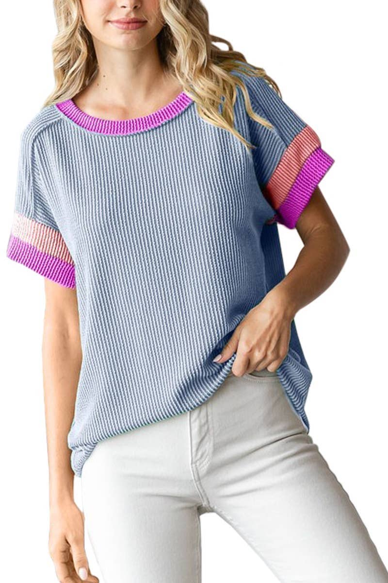 Wholesale MCT7688-Loose Fit Striped Short Sleeve Crew Neckline Top