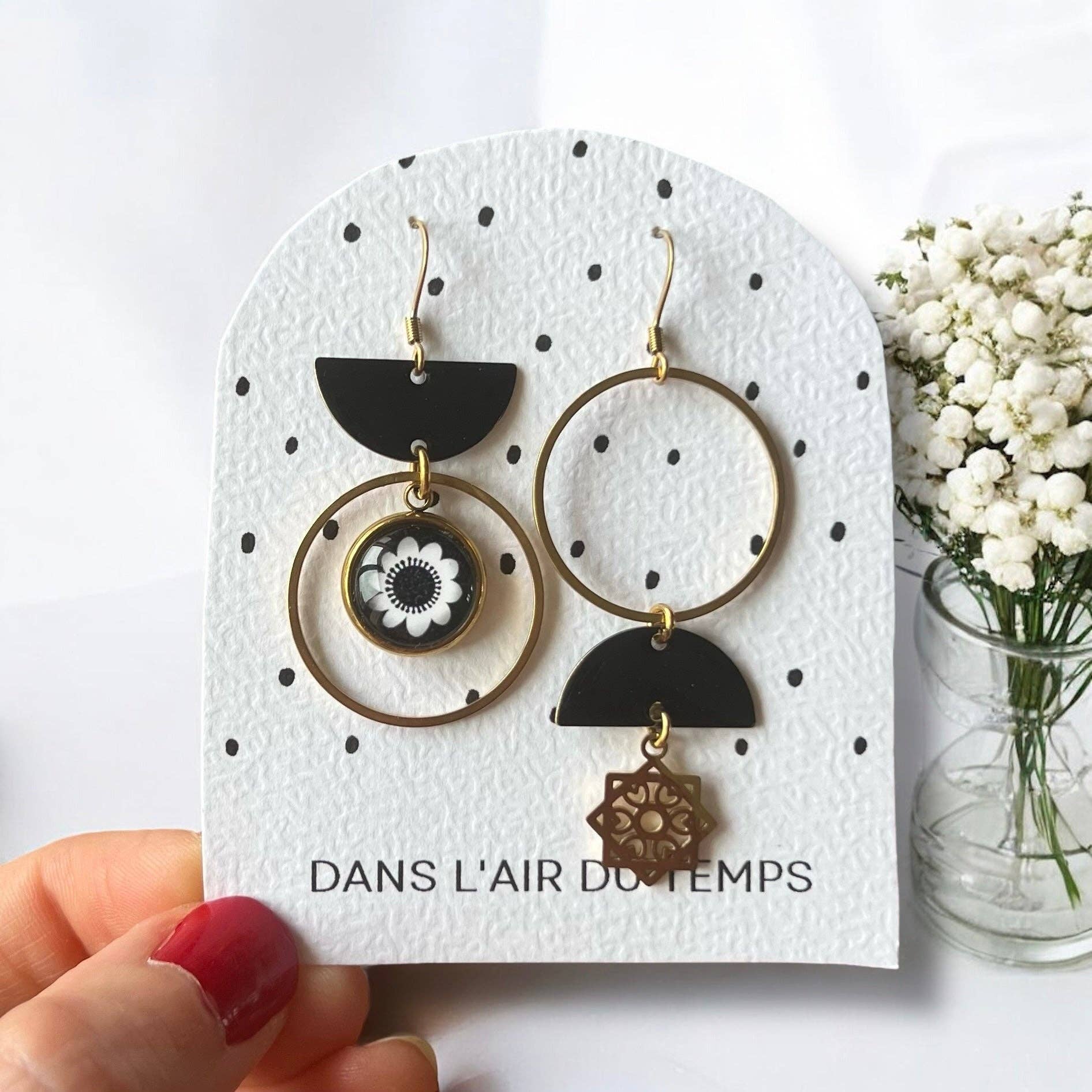 DANGLING EARRINGS, black and white flowers with gold or silver finish