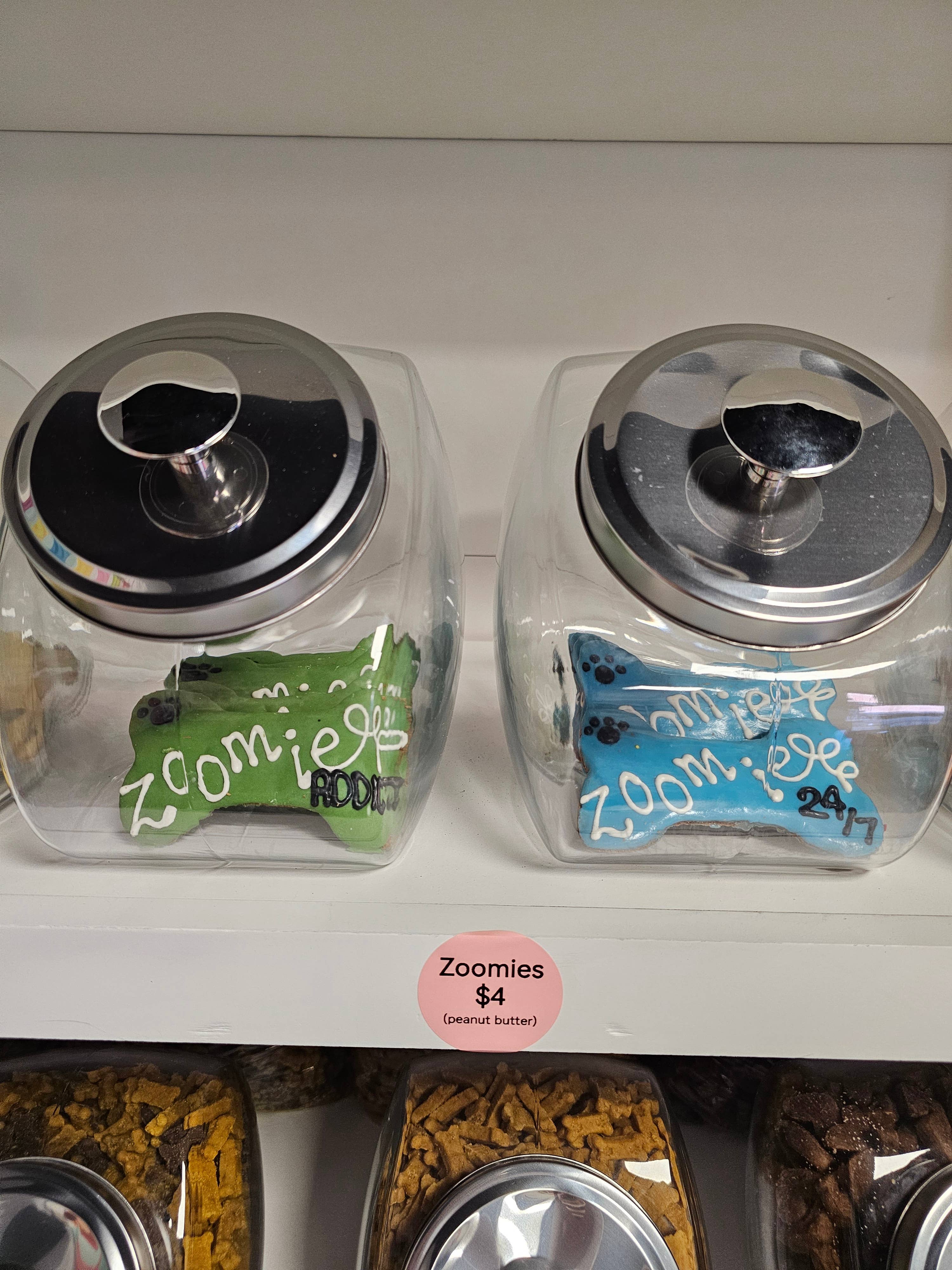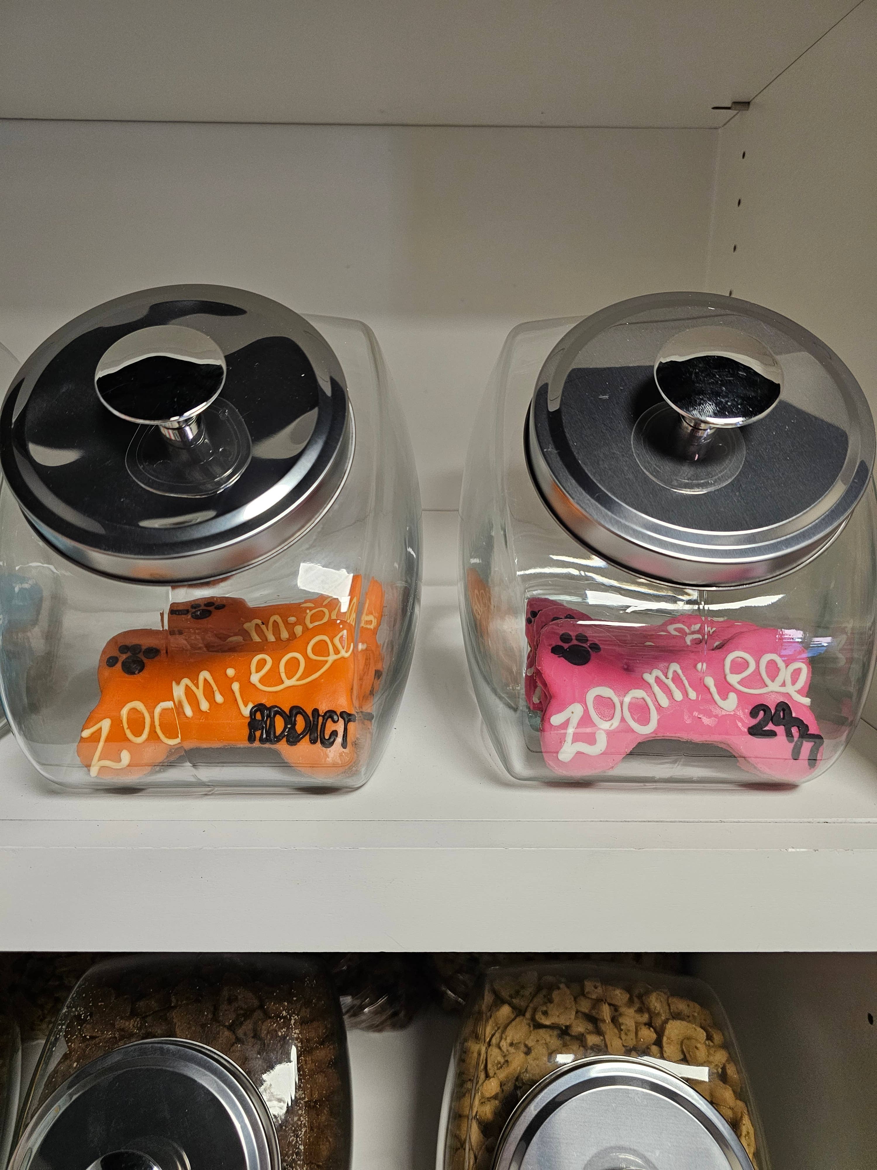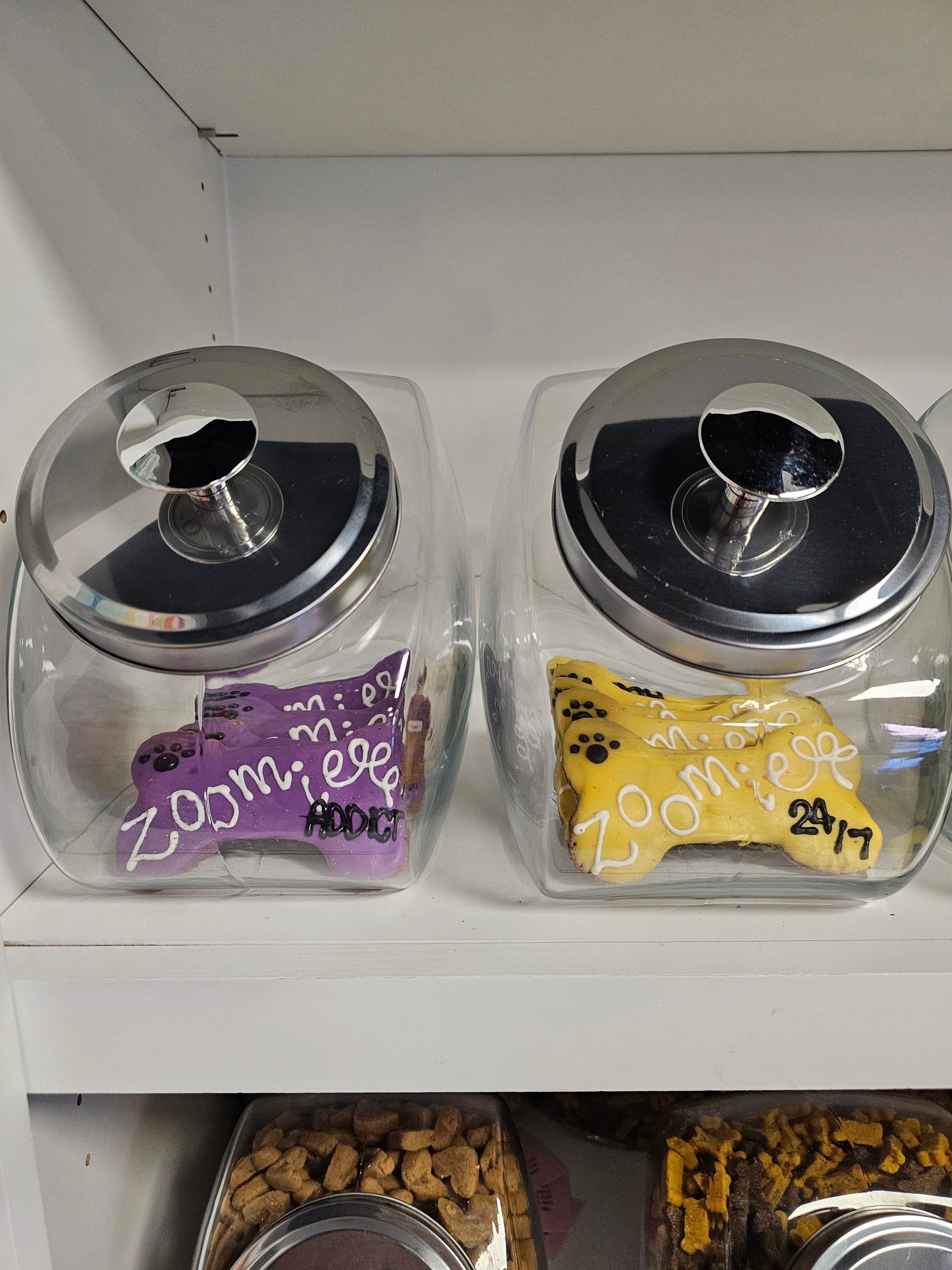 This bone is not only unique to YumYum4dogs, it is delicious & nutritious funny treat that owners can feel good about treating to pup on their big day! Our pup has been zooming her whole life & yours probably is too lol! She’s 100% a Zoomie Addict! Handcrafted from only quality all natural ingredients, all yumyum4dogs are baked with love in small batches. This bone is a 6 inch bone hand dipped in natural yogurt icing, the sprinkled with human grade jimmies. Case includes 2 of each color (blue, pink, yellow, green, purple & orange) with ZOOMIE ADDICT & ZOOMIE 24/7 Store treats at no greater than 72 degrees out of direct light to avoid meltage. 6-12 month shelf life if stored properly (out of direct light, in cool, dry area) Ingredients: Peanut Butter, Whole Wheat Flour, Canola Oil, Cinnamon, Oats, Eggs and Honey. Crude Analysis: Crude Protein (min.)..13.0% Crude Fat (min.).........10.0% Crude Fiber (max.)......2.2% Moisture (max)……….…3.5%