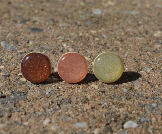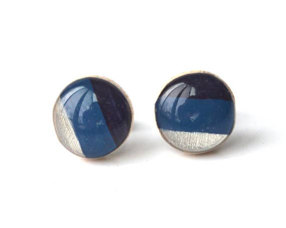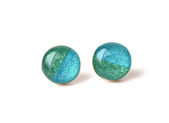 Handmade rose gold and gold two tone metallic Wood post earrings made from a fallen tree branch. Studs are hand painted and topped with a coat of resin to create a glass like finish. Posts are surgical steel, so are fine for sensitive ears. Each piece is sanded down smooth , created and sealed with a coat of resin to give a glass like finish. Materials: wood, resin, paint, surgical steel posts.