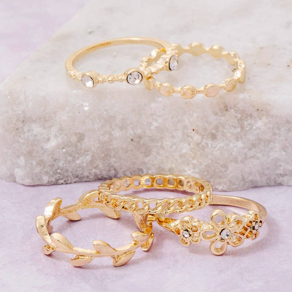 Mix it up with this treasure trove of rings! This ultra packed ring set includes 19 thin gold and silver stacking rings in various symbols and designs. There is a ring here for everyone. Wear them individually or stack them on for an amazing boho look! * Made in China * Assorted theme rings including nature, southwest, beach and celestial designs * Assorted women's sizes within a set * Dimensions: 1/8 - 1/2" wide, ast. sizes within a set * Materials: Plated Metal, Enamel