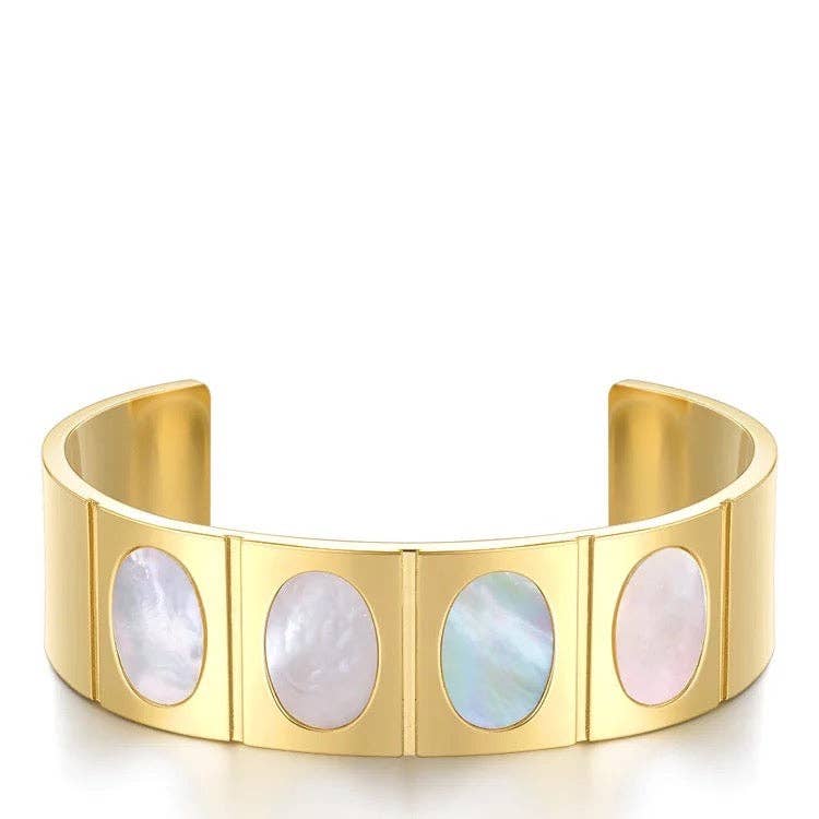 Iridescent shell is the star of the show on this cuff. Pair this cuff with the Alys Bangle Bracelet for a complete look. * Made from gold plated stainless steel * Adjustable * 7 inches * Mother of Pearl detail