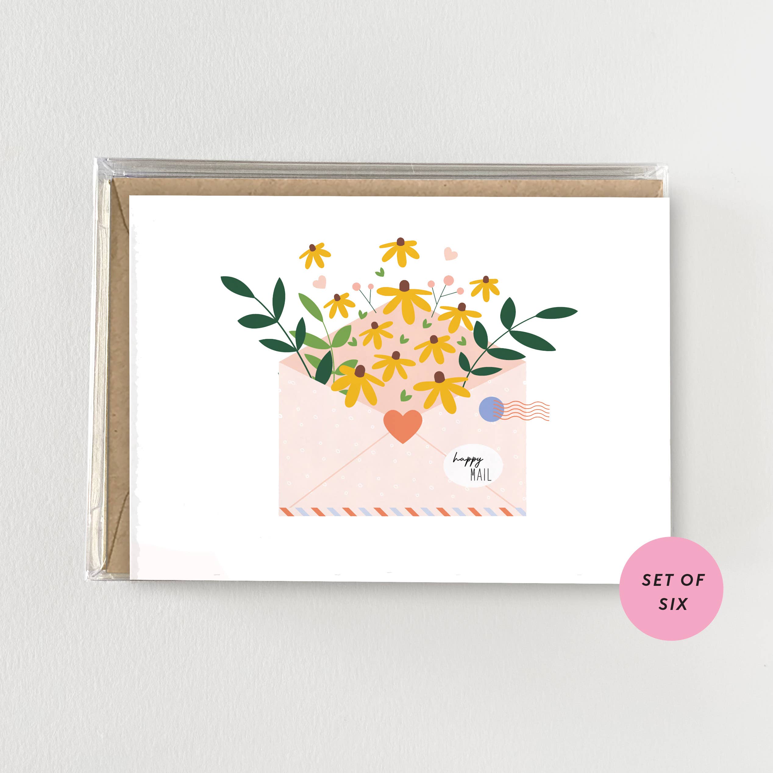 This assorted boxed set note cards comes with 8 note cards and 8 adorable brown bag envelopes to seal in the cuteness. As with all Whimsicals note cards, these cards are blank inside. This assorted pack contains one each of the following designs: * Poppies - A little note * Daisies - A little note * Owls - A note from guess whooo... * Sunflowers - A little note * Pine Trees - A little note * Flamingo - A little hello * Aspen Trees - A little hello * Rainbow Hearts - hello there DETAILS * 8 assorted note cards - blank inside * Digitally printed on white cover stock * 8 brown bag envelopes * Packaged in a kraft paper card box SIZING * Card Size - A1 / 4bar