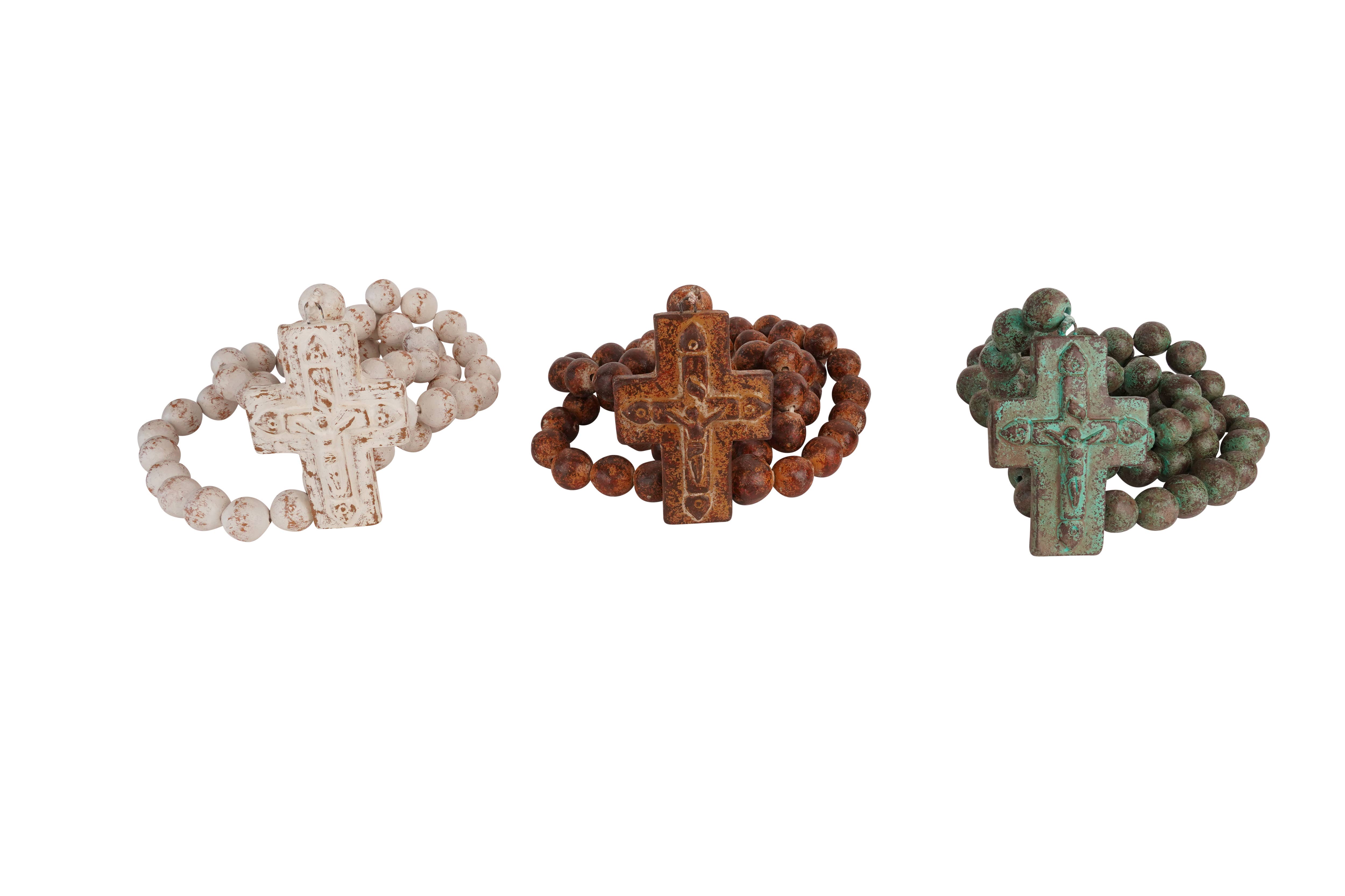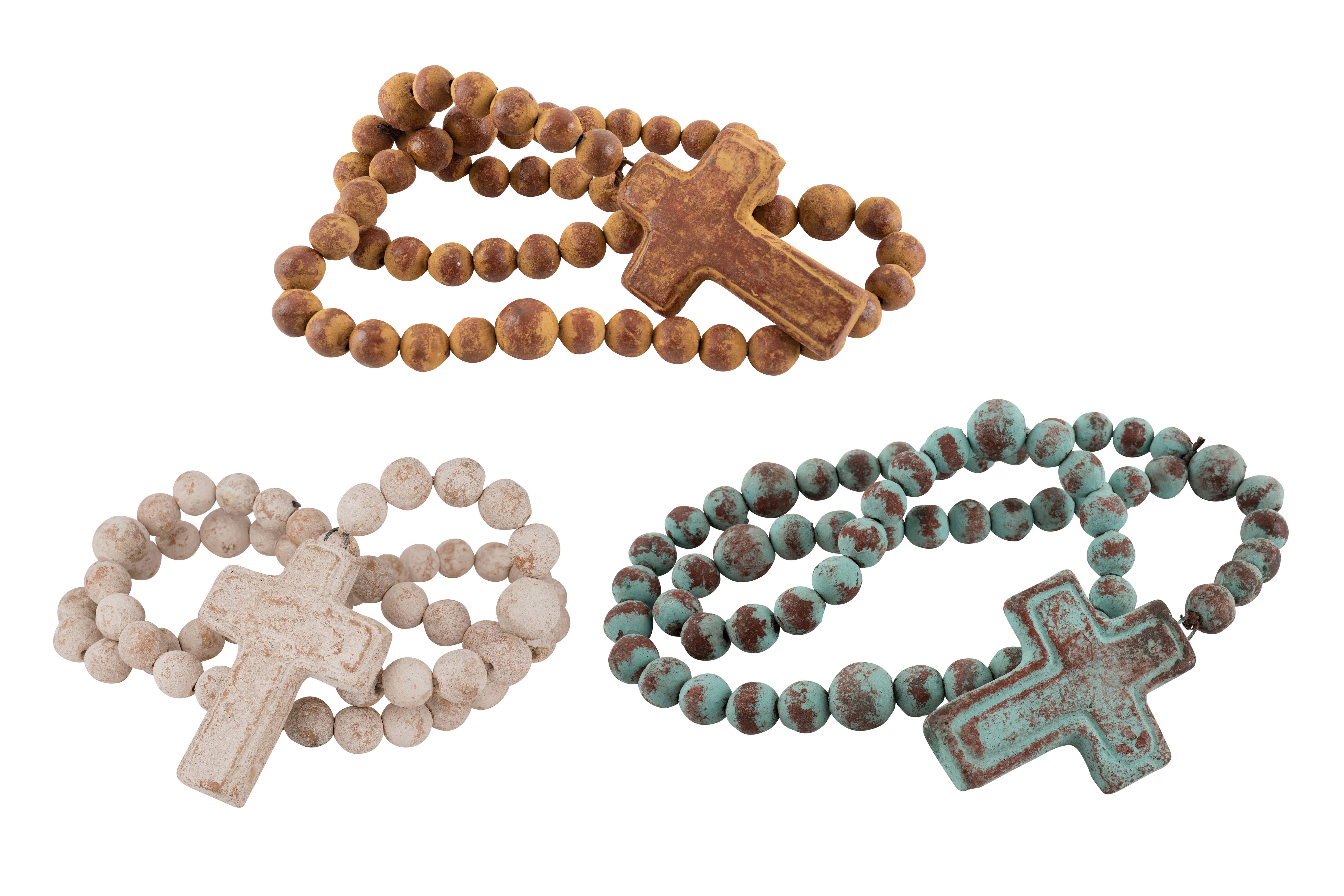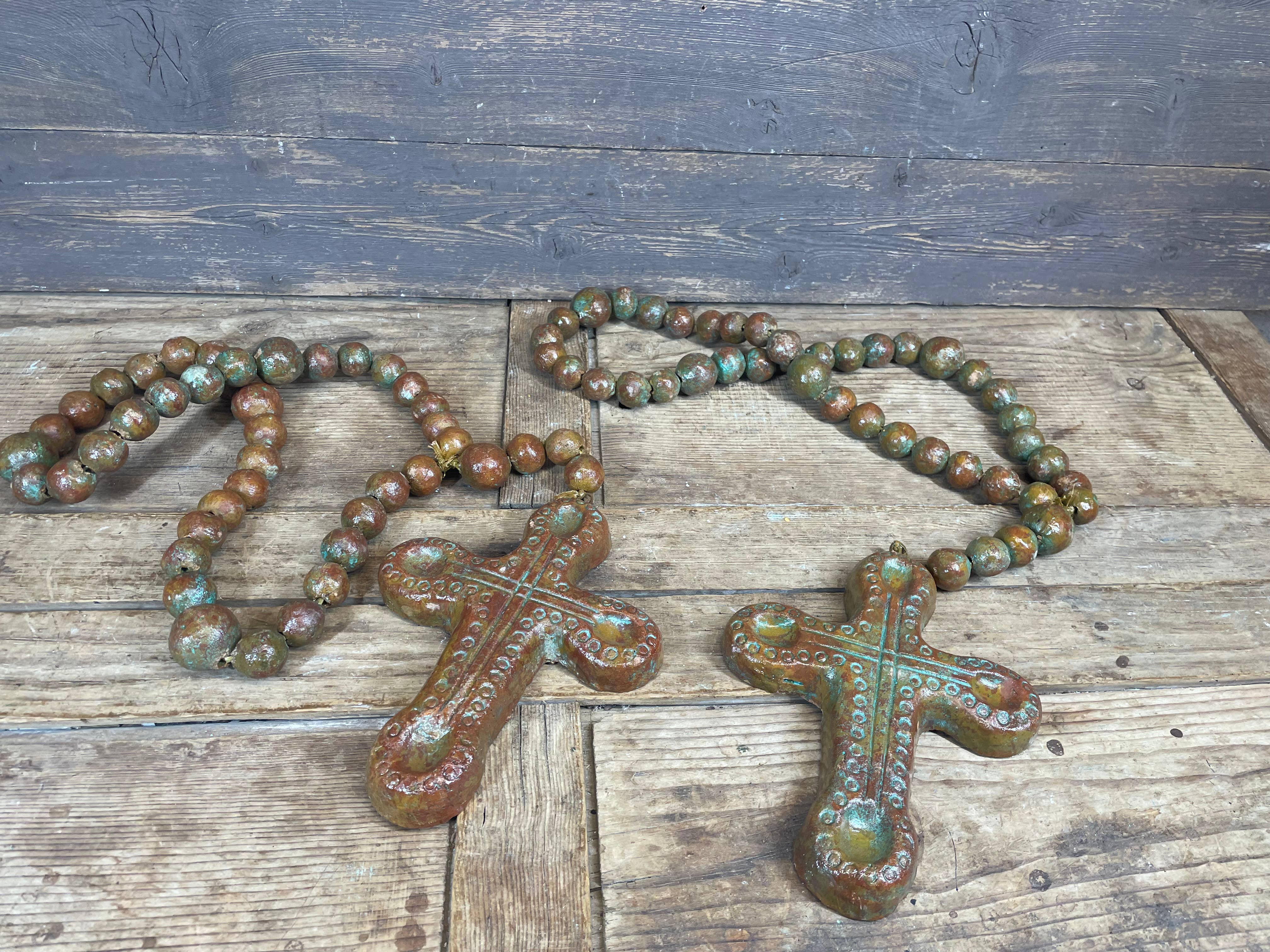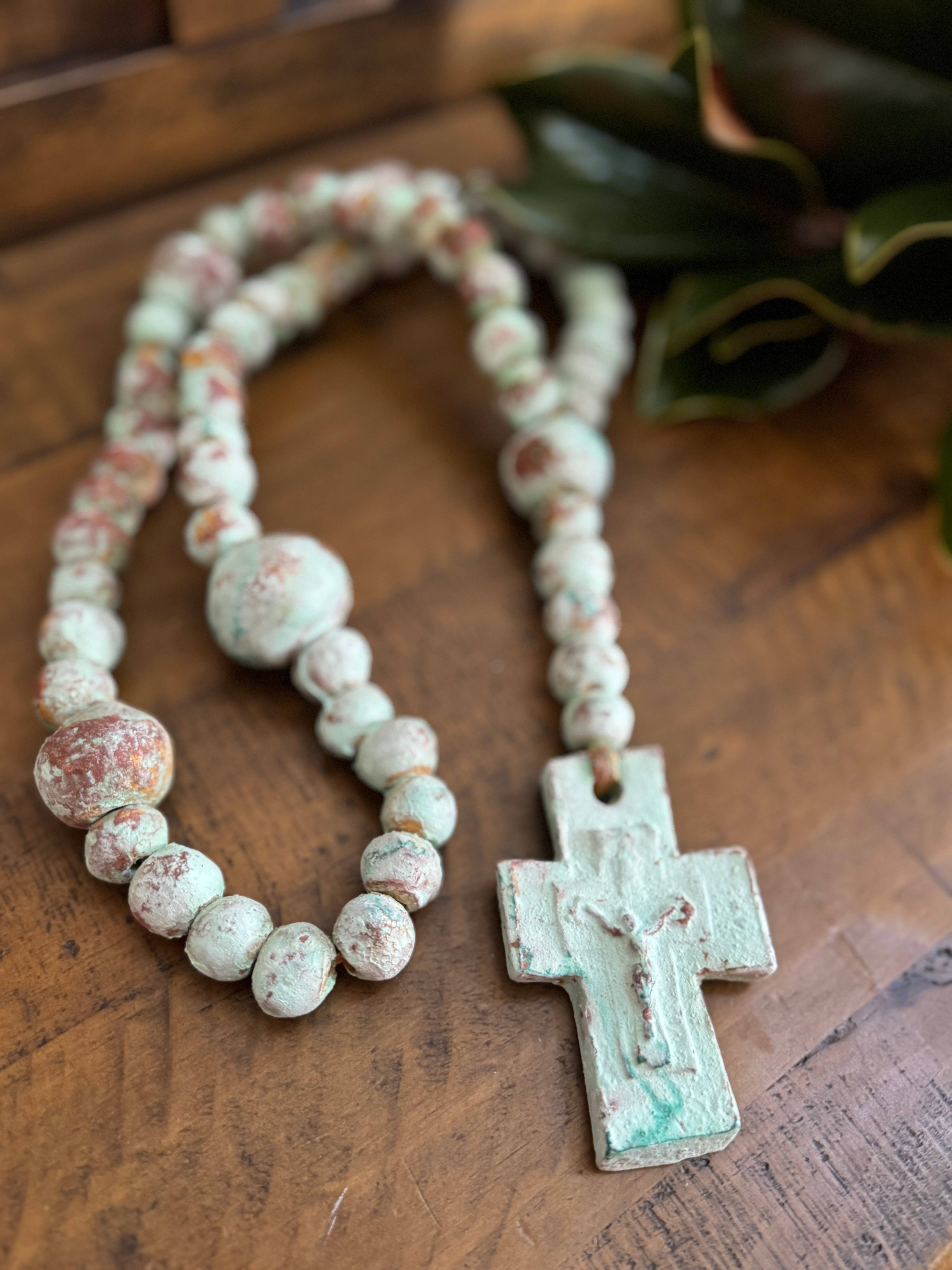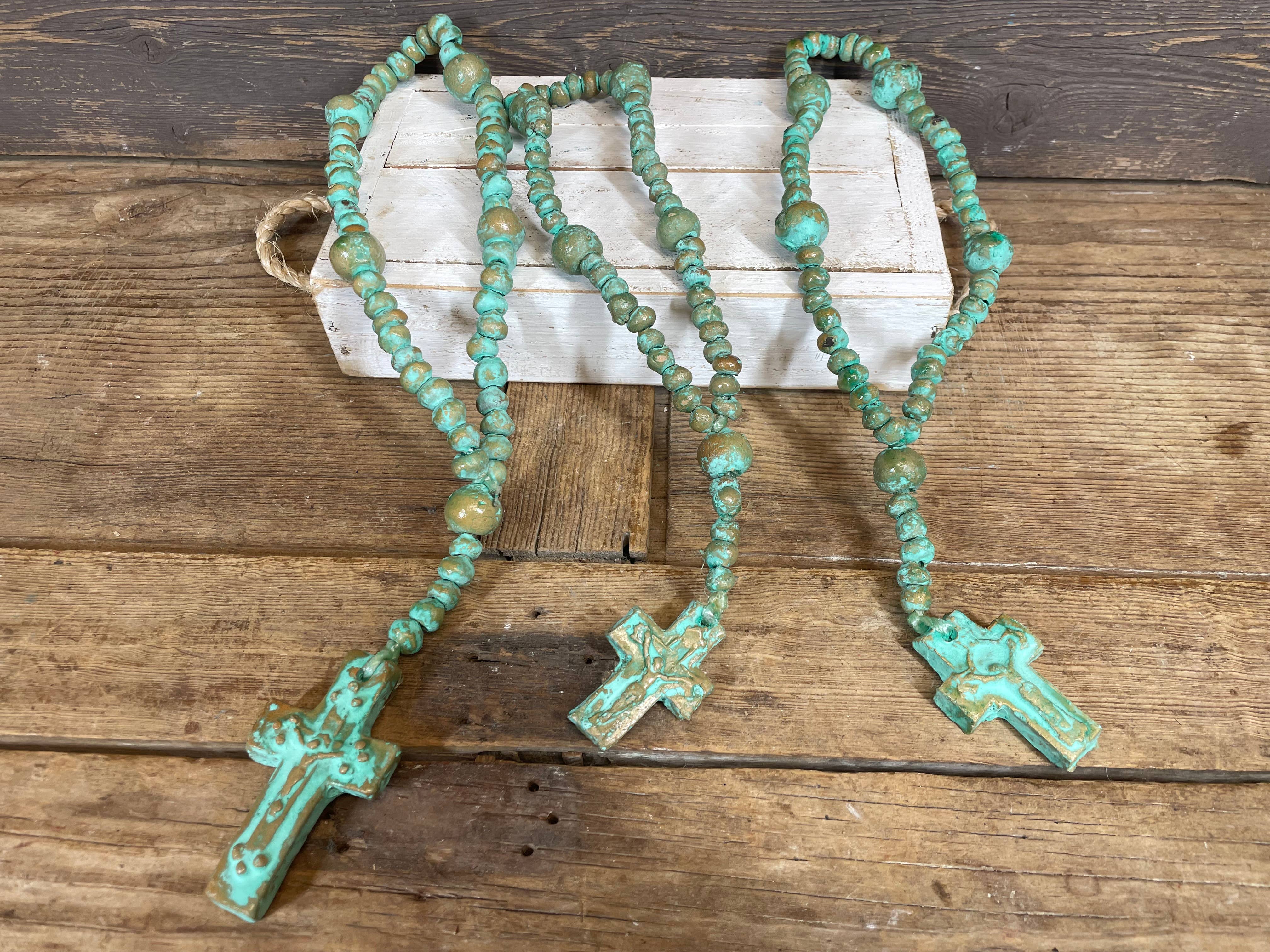 Clearanced priced.. reg.. $34,now only $17.. half off.. while supplies last. The photo is a representation of what you will receive on this Green tone Clay Rosary beads. Same design, just each unique, hand painted. Colors and size will vary so keep that in mind. This is great work, done by artisans that have learned the trade from their parents. Each is one of kind. Great design. This beautifully handmade rosary beads measure about 30-44 inches long. The cross itself measures about 7-8 Wide x 9-10H inches. Size and color may vary a bit as each is handmade. So put away your tape measure and enjoy the variances and their beauty.