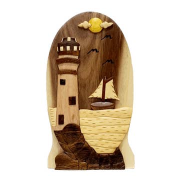 Note: Black interior with a magnet in the pin only (BPO). The To, From, Date, and Occasion engraved on the interior compartment lid can be personalized by using a permanent marker. This will create a memory that will last a lifetime. This hand-carved wooden keepsake gift box is made of recycled hardwood. Remarkable enough to be a gift on its own, this handcrafted gift box includes a hidden compartment to stash away trinkets, money, jewelry, and other gifts or personal keepsakes. This gift box is truly one of a kind and is the perfect gift for family, friends, and co-workers! Since each box is hand-made and hand-carved, no two are exactly alike. The exotic hardwoods are hand polished, and no paints or stains are used to create the beautiful piece. The design and craftsmanship make it a beautiful décor piece in your home or office. Approximate Exterior Box Size 7" Long x 4" Wide x 2" Deep Approximate Interior Compartment Size 4-1/2" Long x 2-3/4" Wide x 3/4" Deep