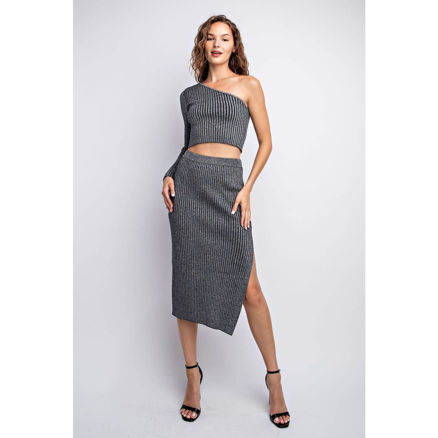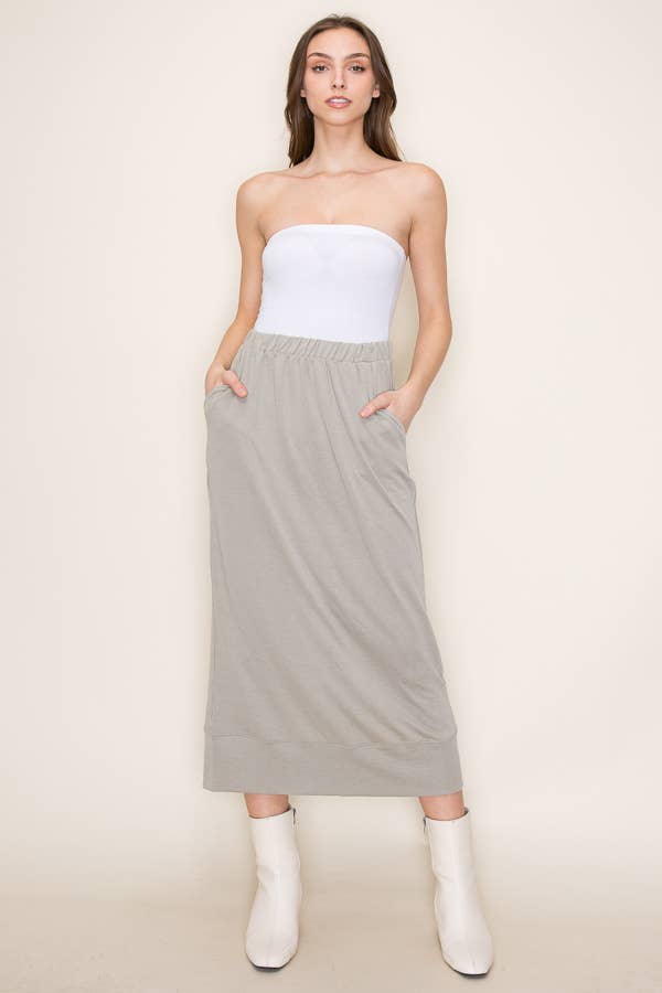Midi skirt with elastic at the waistband and ruching detail with spaghetti tie at the front side slit.