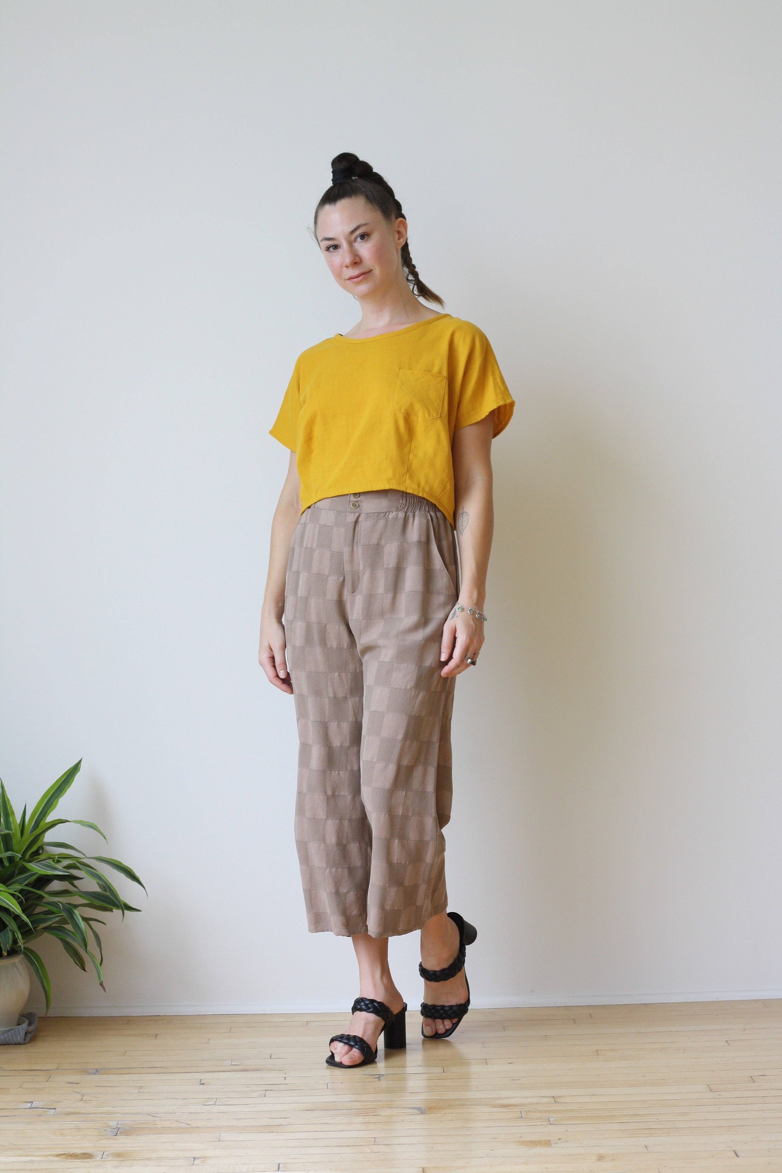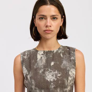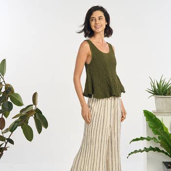 Color: faded army green. 100% garment dyed cotton. Made with OEKO-TEX certified low-impact dyes. Sporting our brand new Vertigo print, this unique muscle tank style combines a power shoulder and heavyweight cotton fabric with a feminine silhouette and just the right amount of drape. Perfect for pairing with your favorite high-waisted jeans. Hand printed with black water-based ink. Available in women's sizes S-2XL. Model shown is 5'8, size 8 (36B bust), and is wearing a large. Due to the garment-dyed nature of this top, there may be a slight color variance from piece to piece.