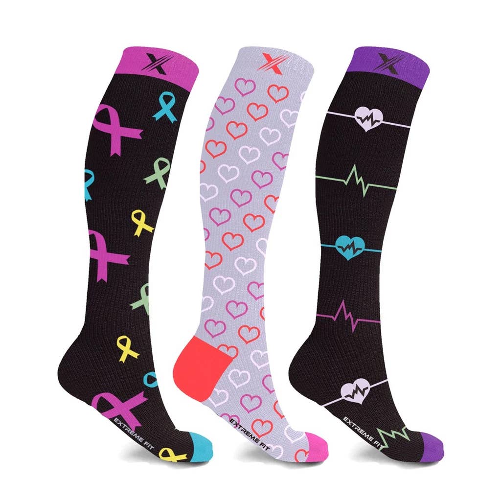 Case Pack 12 Pairs per Case (Assorted Styles, Individually Peggable) Description These graduated compression socks (15–20mmHg) are designed to support circulation, reduce swelling, and relieve leg fatigue with a soft, non-binding comfort band. Ideal for wellness shops, pharmacies, and gift retailers, each pair is peggable and barcoded for easy merchandising. This collection supports the National Breast Cancer Foundation—proceeds go toward awareness, early detection, and survivorship initiatives. Key Features Graduated compression: 15–20mmHg Helps improve circulation and reduce swelling Soft, non-binding comfort band Individually peggable and barcoded Includes assorted styles and sizes Sizing: S/M: Men’s 6–9, Women’s 5–10 L/XL: Men’s 9–12, Women’s 10–12 2XL: Packed 3 pairs together Portion of proceeds supports Breast Cancer Awareness Case Pack 12 Pairs