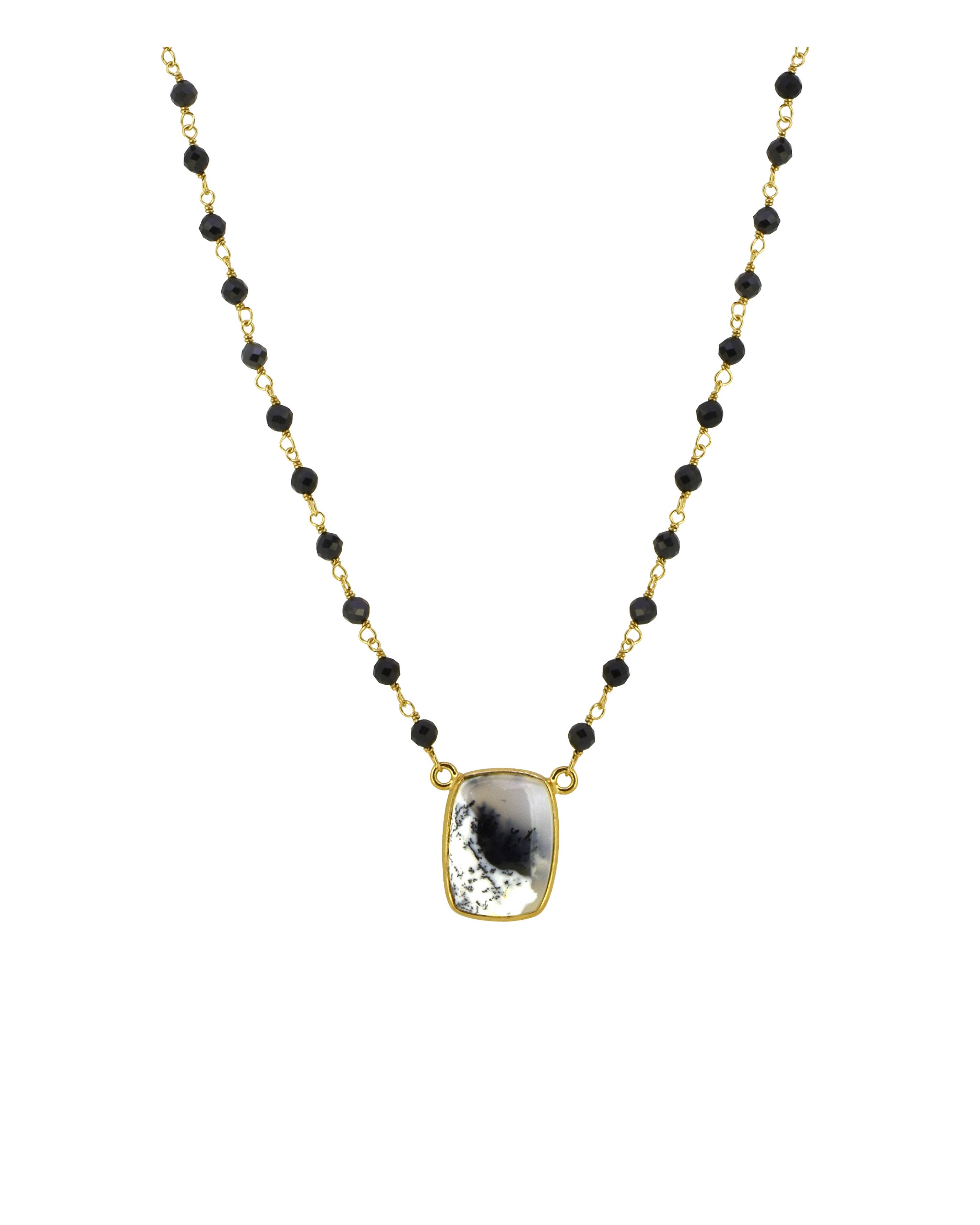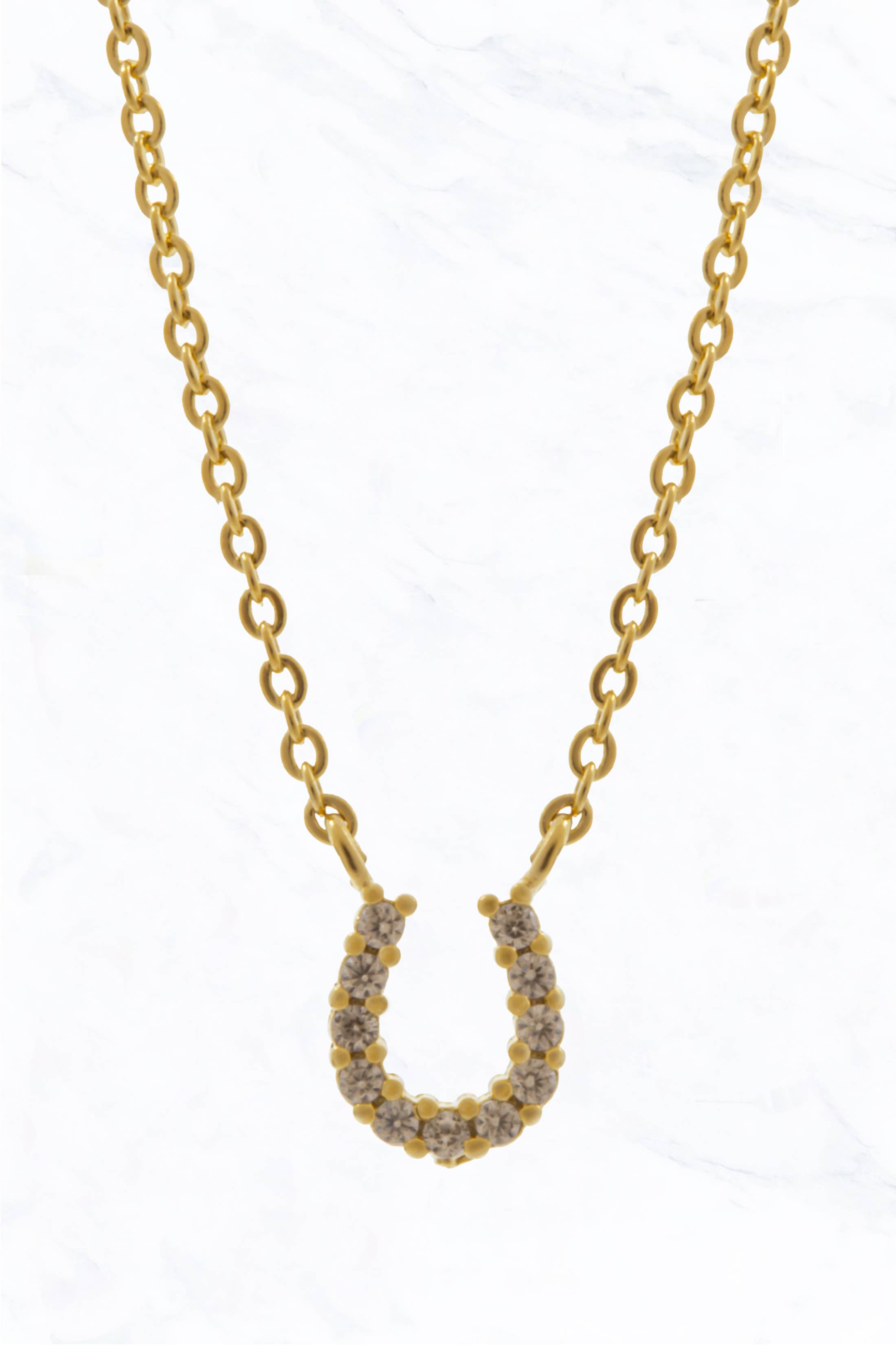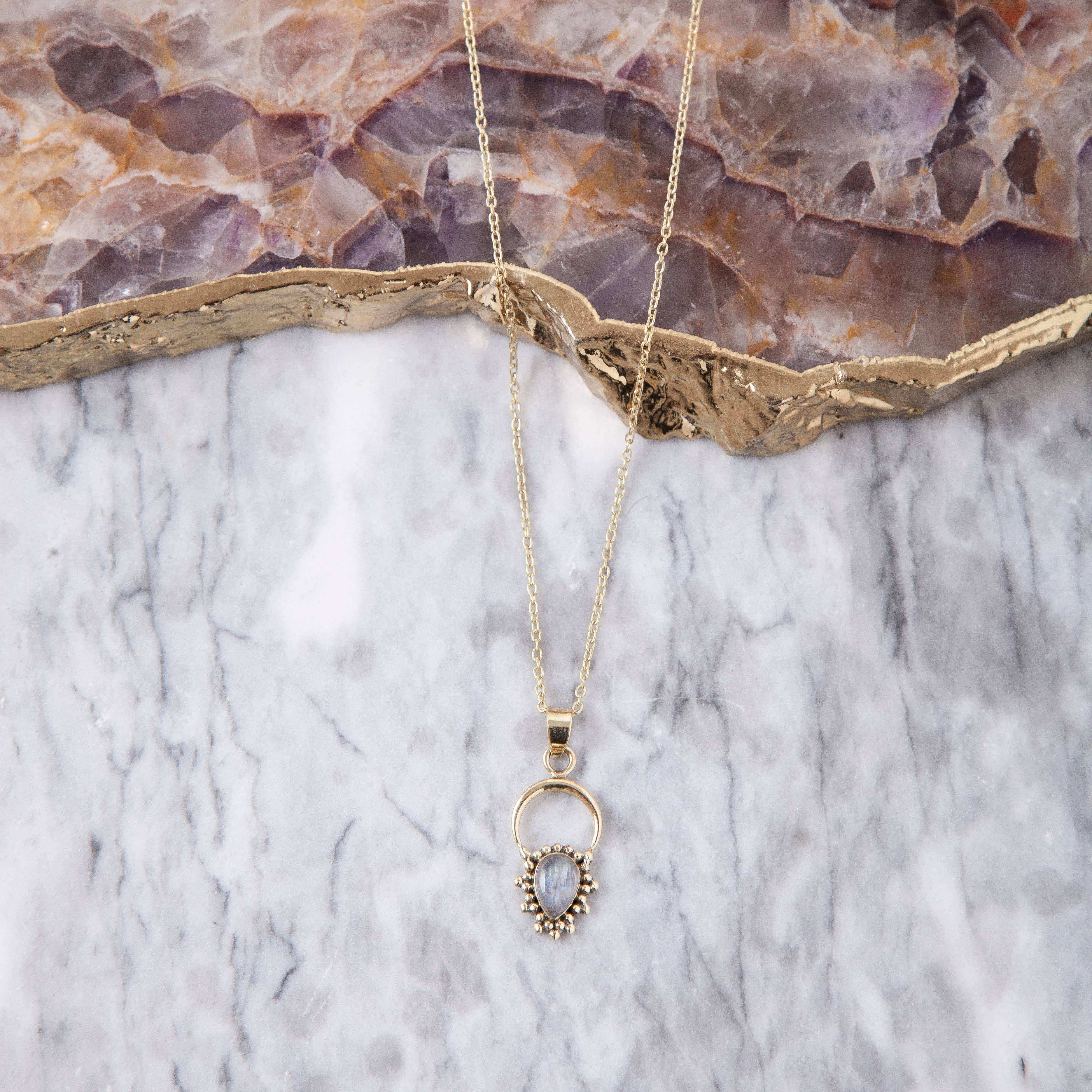 The necklace is made with a hammered brass Pinched “U” hand-forged from brass wire featuring a Smoky Herkimer Trio. Black rolo chain has moonstone stacks on both sides. Components are base metal. The chain is coated brass. Every “U” is hand-forged one at a time, leaving each one unique. Measurements will vary up to 3/4" in difference. his “U” pictured is 1 3/8" wide at the widest point and 2 1/4" tall. Smoky Herkimer Trio is roughly 1" wide. The chain is 30".