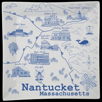 A whimsical depiction of Wisconsin, highlighting notable towns and tourist attractions on a vibrant 16" oval melamine platter. Not for use in the microwave. Scratch and break-resistant. Dishwasher-safe.
