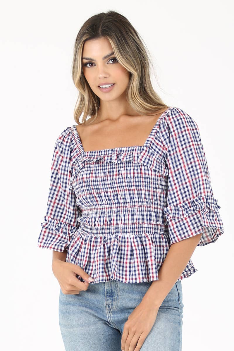 Wholesale CT8888-Plaid Ruffle Hem Top