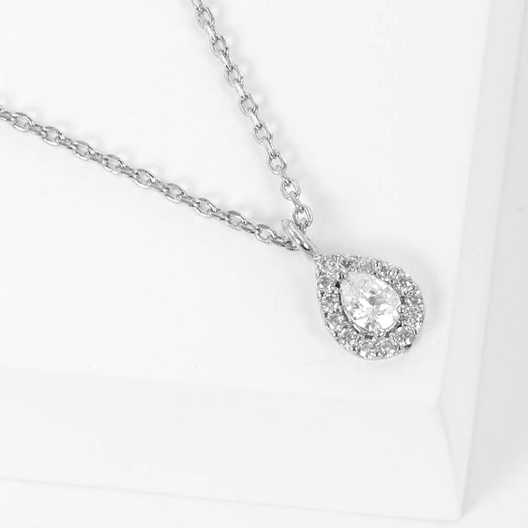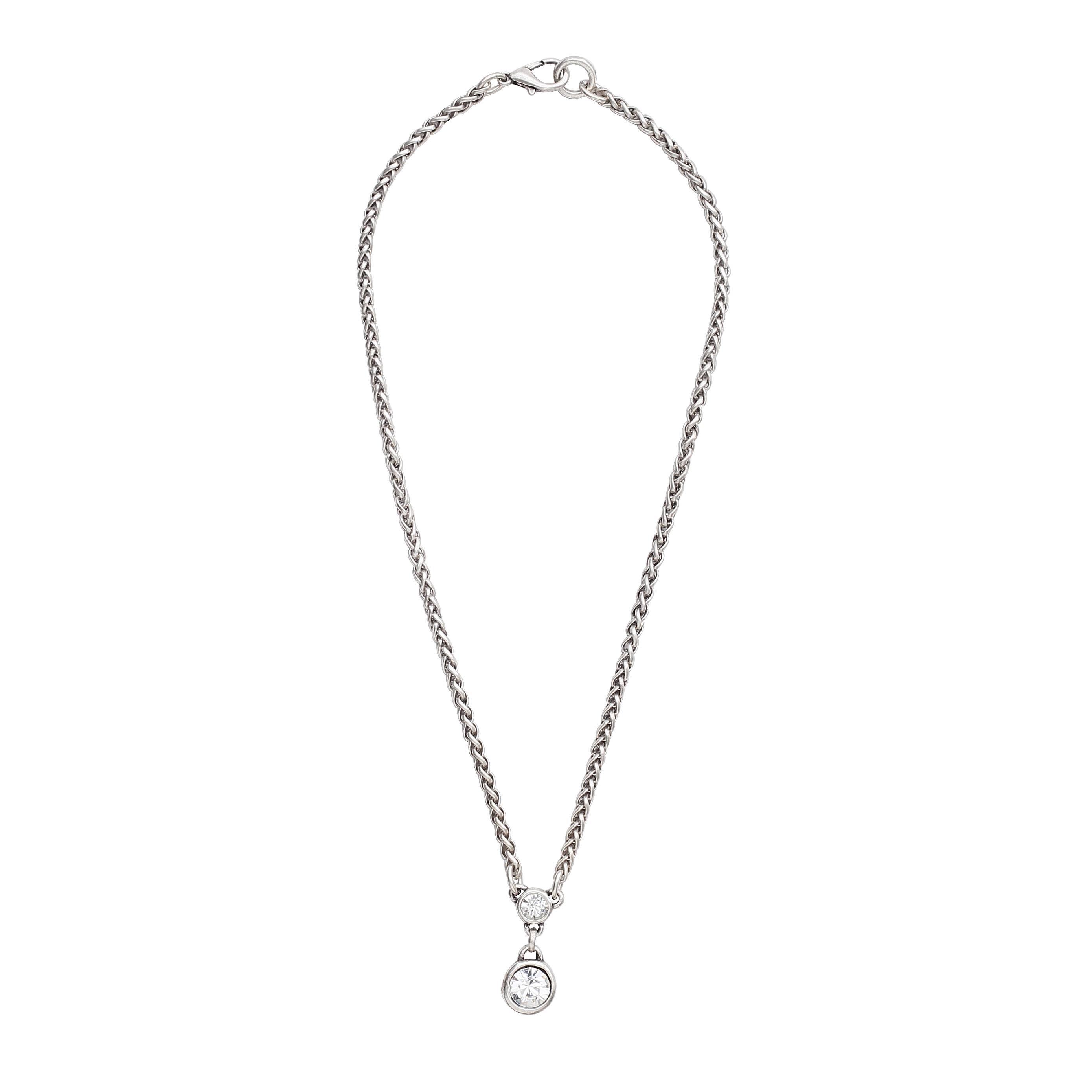A sophisticated necklace that is easy to wear and will become a staple in your jewelry collection. Elegant and classic, pair this necklace with leggings and a tunic for a casually chic look. Gift this to the woman that loves simple and unique accessories. +Size: 32" necklace length, 1" pendant drop +Materials: Austrian crystal and cubic zirconia +Metals: silver-plated pendant, sterling silver chain and components