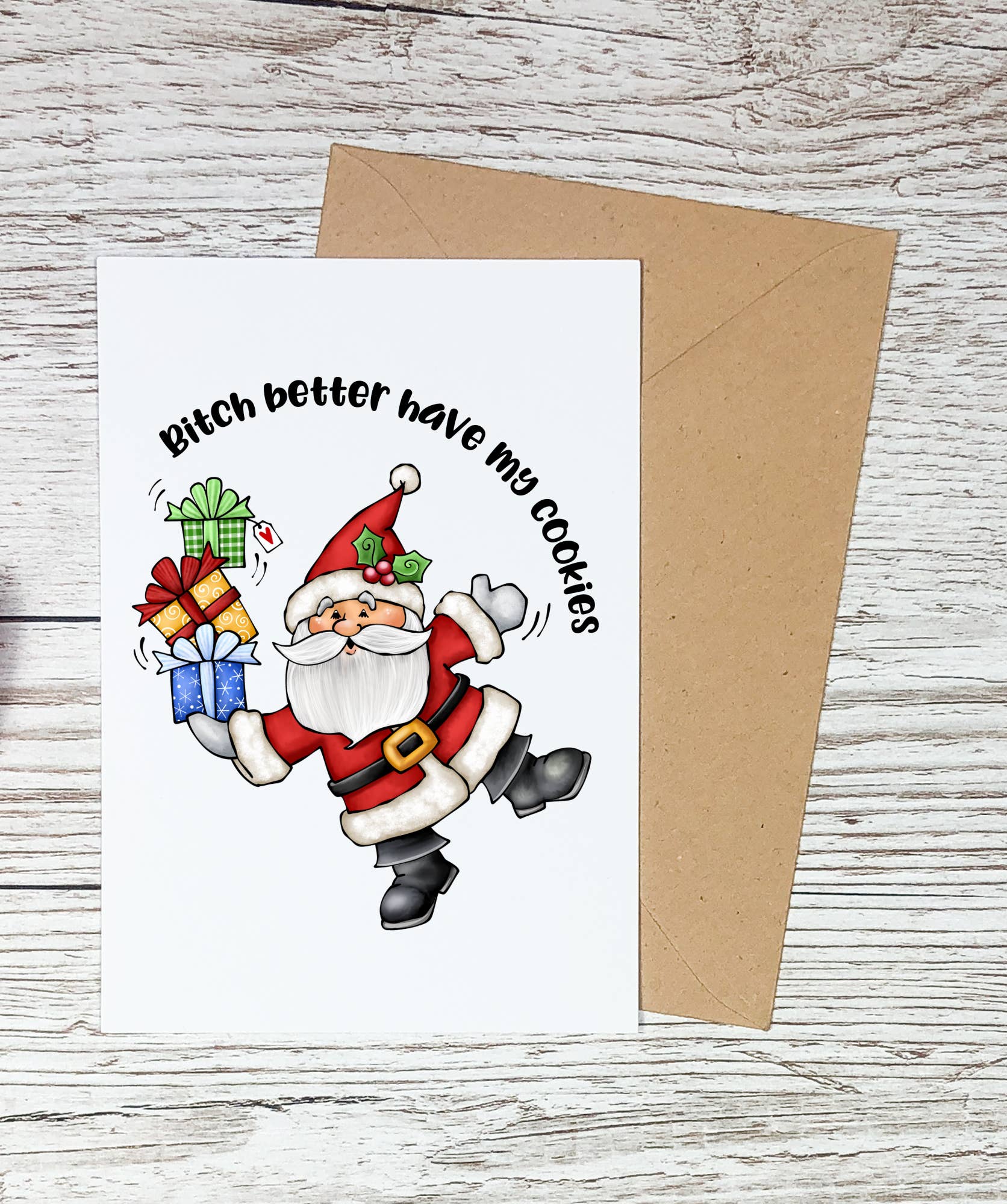 Celebrate the holiday season with a dash of snarky humor with our "BitchBetter Have My Cookies" funny Santa Christmas card. Did you know that Santa has expectations higher than the North Pole? You better live up to his standards if you want to remain on the nice list! Details: • Premium quality, soft touch cardstock • Includes an A2 kraft envelope (4-3/8" x 5-3/4") • Blank inside • All cards are individually packaged in a cellophane sleeve 🇺🇸 Each card is printed in the USA.