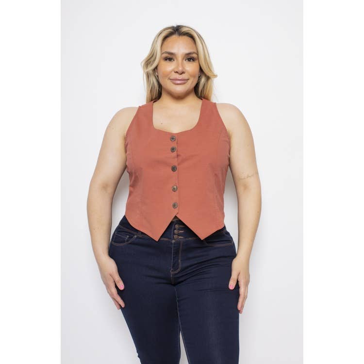 Solid, racerback vest with button down closure, and adjustable back belt.Introducing our Solid Racerback Vest with Button-Down Closure and Adjustable Back Belt – a chic and versatile addition to your wardrobe that combines style and practicality. Sleek Design: Our racerback vest boasts a clean and contemporary design, making it a fashion-forward choice for any occasion. Button-Down Closure: The front of the vest features a row of buttons that not only adds a touch of sophistication but also allows for easy wear and removal. Racerback Style: The racerback design showcases a sporty and stylish look, perfect for adding a modern twist to your outfit. Adjustable Back Belt: The vest comes with an adjustable back belt that can be cinched to your desired fit, providing both comfort and a flattering silhouette. Solid Color: Available in a range of solid colors, our vest allows you to express your personal style. Whether you prefer classic neutrals or vibrant hues, there's an option to suit