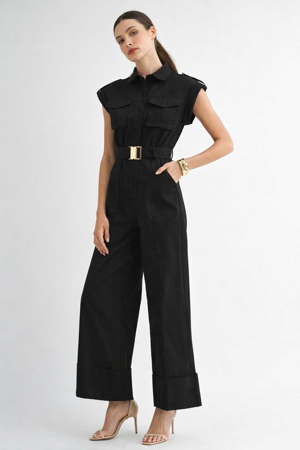 Wholesale Chic Star Plus Size Linen One-Button Belt Jumpsuit In Black