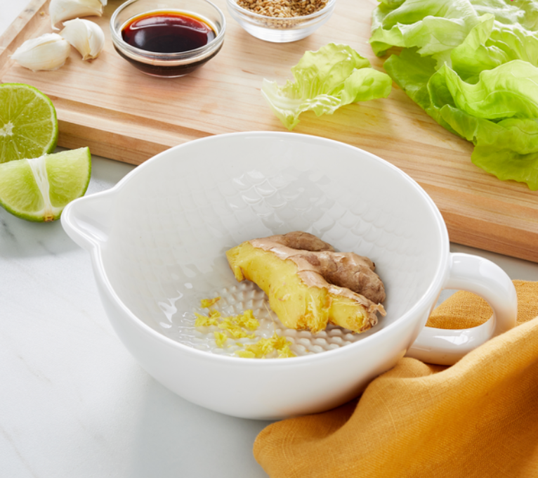 Porcelain dish with simple etched lines. The perfect cereal or salad bowl, dish measures approximately 7.5 in diameter by 2.5 inches tall.