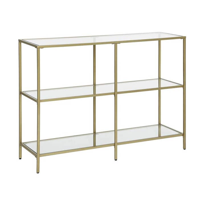 Greenwestons Console Table, a sleek and modern addition perfect for your living room, hallway, or kitchen. Featuring a sturdy gold steel frame and three tempered glass shelves, this table offers ample storage and display space while maintaining a minimalist, elegant aesthetic. Product Details: ---------------------- ✔ Color: Metallic Gold, Transparent ✔ Material: Tempered Glass, Steel ✔ Max Static Load Capacity: 88 lb (40 kg) Dimensions: ----------------- ✔ Overall Size: 11.8"D x 51.2"W x 28.7"H (30 x 130 x 73 cm) ✔ Product Weight: 41 lb (18.6 kg) Perfect for displaying decor, books, plants, or everyday essentials, this modern console table combines style and functionality a versatile piece for any contemporary home!