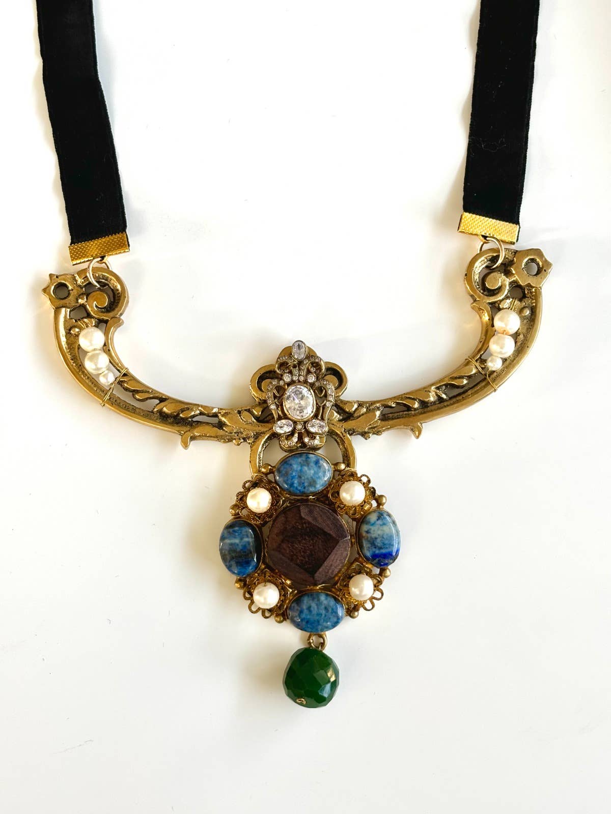 This neckpiece features iris blooms and pomegranates. Made from rich antique gold, opal and garnet, she is the lush and the glamour of Lilith’s garden. She is finished with our signature hook clasp. Neckline is 16” with 3” adjuster -Antique gold overlay over brass, bronze and pewter -Garnet -Opal