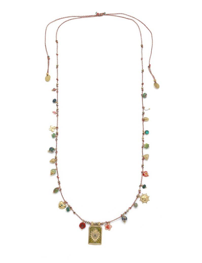 Materials: Swarovski crystals, glass cabochons. Metal: 24k gold electroplated over brass. Size: Chain adjustable 16 x 20 inches, pendant 1.5 inches long. Lobster claw clasp. Handmade in our NYC studio. Complimentary gift wrapping.