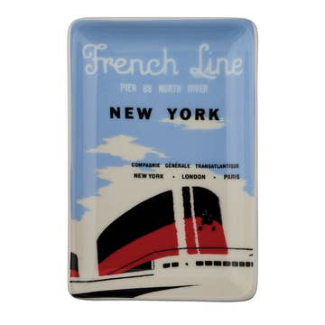 In the French tradition of Decoupage, this bent-glass tray was handcrafted in our New York Studio. This illustration reflects Ben's unique aesthetic for the charming and unusual. Each is individually signed by Ben. Both practical and charming, Ben's signature glass decoupage is food safe, wipe clean and the back side is felted. Also suitable for hanging with a plate hanger and attractive standing on a gallery easel. A folded card explaining the time honored decoupage process accompanies each piece. Style#: DPQ-61