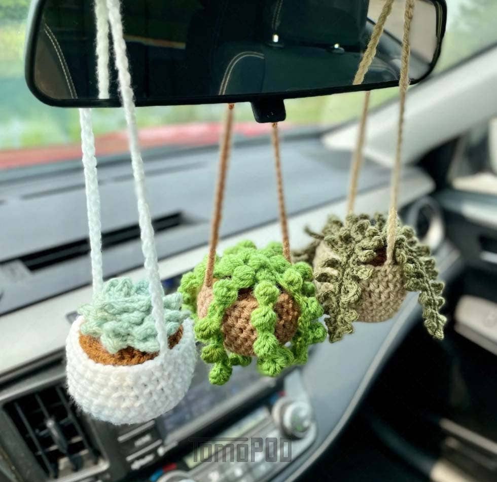 🌵 Handcrafted Crochet Hanging Succulent Plants 🌿 Each succulent car crochet tree is meticulously crafted by hand with 100% natural cotton. These decorative pieces aim to bring joy and relaxation to the driver, especially during long and tiring trips. 🌿 Dimensions: Hanging basket length: approximately 7 inches (18 cm) Pot width: 2.3 inches (6 cm) Pot height: 2 inches (5 cm) 🌿 The cute mini potted pendant makes a thoughtful gift for girlfriends and can be given throughout the year. It's also a great option for gifting to friends and family.