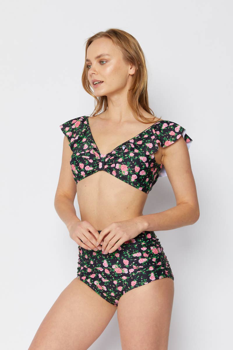 Retro style 1pc w/ruffle around leg-F1824_Blk Roes Sky