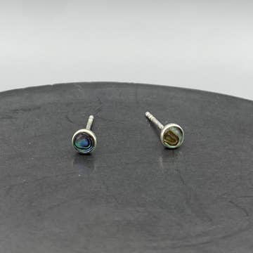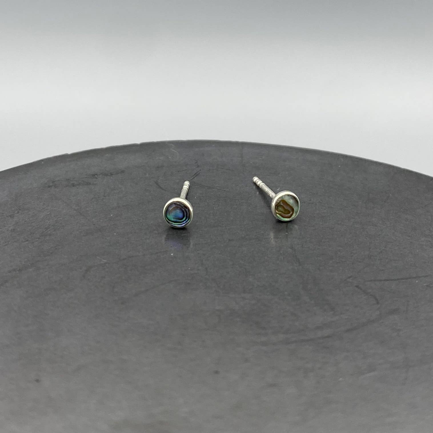 Grey stud earrings in a great marbled lucite with an Aurora Borealis finish that glows with hints of pink and blue. This is the 'Retro Button Stud' style & is a domed button with a flat back. This pair measures just over 1/2" or 15mm in diameter. See the pic of the model in the Retro Button Studs in another color, but the same size to get an idea of scale when they are worn. Most all earrings are made with vintage lucite parts that were made in Rhode Island in the 1960's - early 80's by Best Plastics. We hand-set them with surgical steel earring posts and they have sturdy surgical steel/acrylic backings on them as well. Light-weight & fun to wear.