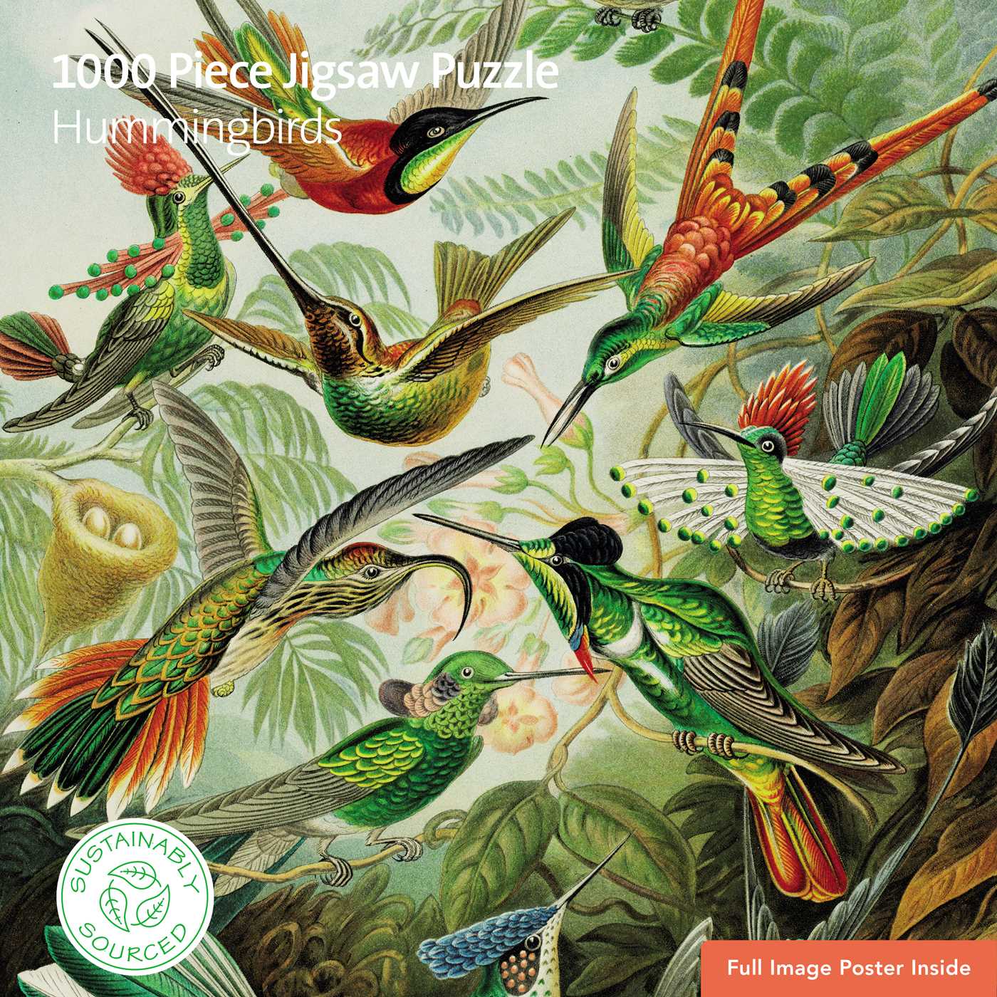 Take on the extra challenge of a round jigsaw puzzle inspired by vintage ornithological illustrations. This beautiful garden full of hummingbirds in flight will transport any family of puzzlers into focused calm. •500 sturdy, dustless pieces •Completed puzzle: 23” diameter •Box size: 10” x 10” x 2” •Includes full-color insert for reference •Curated Artist’s Playlist via QR code on box •Sustainably Sourced: Made with recycled board and printed on FSC®-certified paper using vegetable-based inks