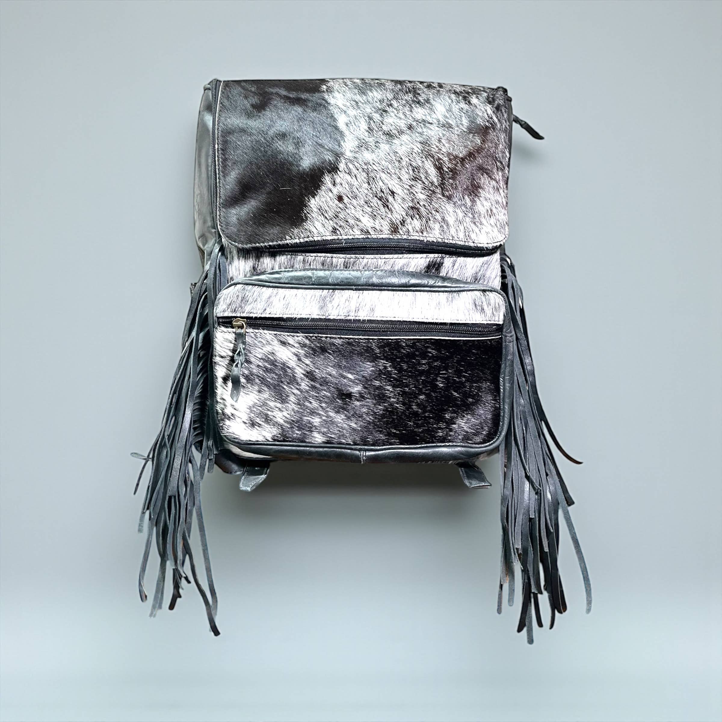 Back Pack with Fringes and a hand laced front flap. It has a knotted closure with a braided loop. It has adjustable shoulder strap and a clutch handle on top. It has a zip pocket inside. It is available in Tan, Black and Brown. It has closure strings on top sides with a bone bead to adjust