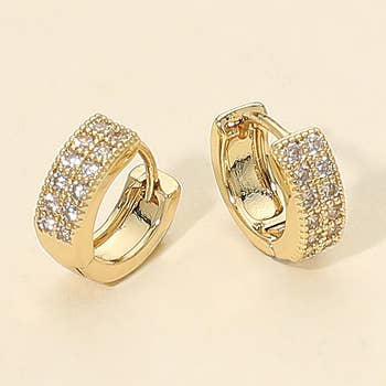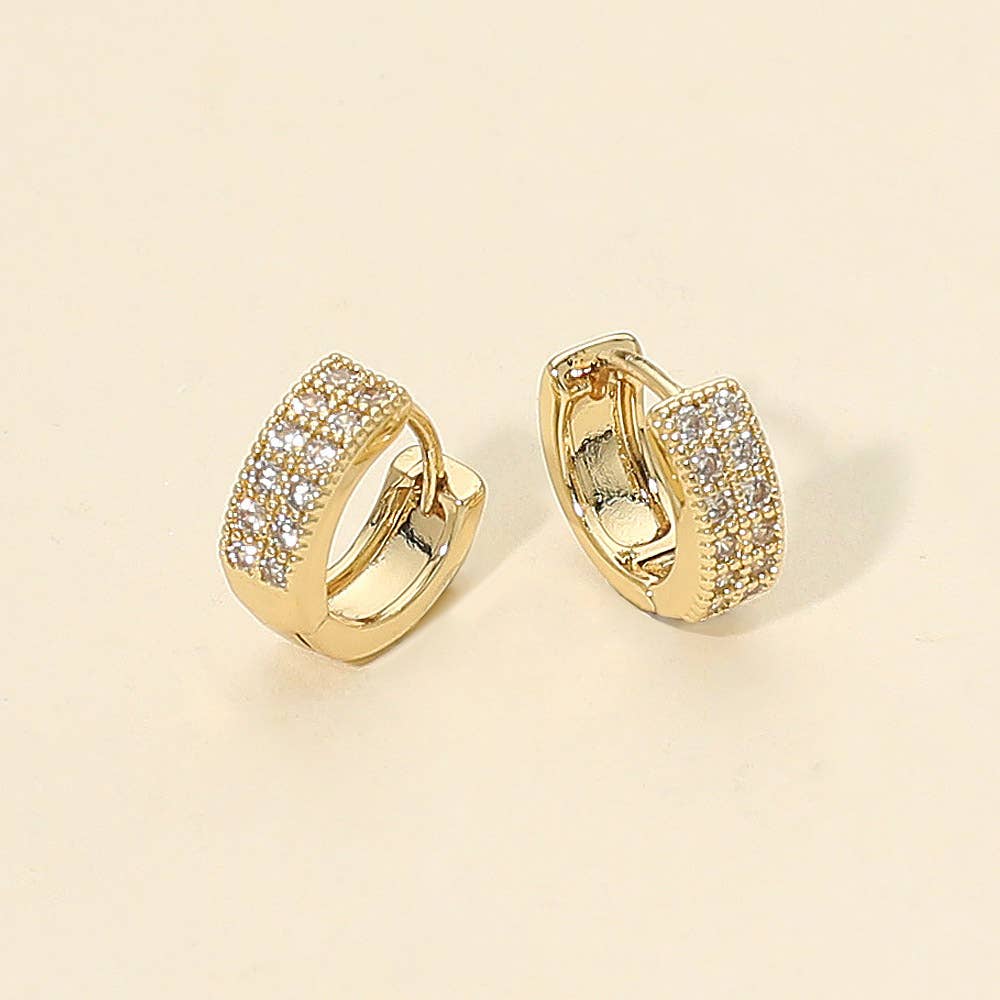 Mini cutout checker hoop huggie earrings small hoop earrings with a distinctive checkerboard pattern, featuring cutout sections. The huggie style suggests a snug fit to the earlobe. This type of earring is likely to be a stylish and modern accessory, providing a balance between classic hoop design and contemporary detailing with the cutout checker pattern. Product details: length: .75" width: .75" earring back: Post metal finish: Gold Plating product: Lead & Nickel Compliant anti-tarnish: Double E-coating
