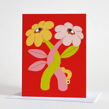 Two Koi swim among the lotus leaves beneath hanging paper lanterns. Rendered in watercolor and colored pencil. This single fold Note Card 5.5” x 4.25” is printed on natural white card stock with matching euro-style flap envelope.