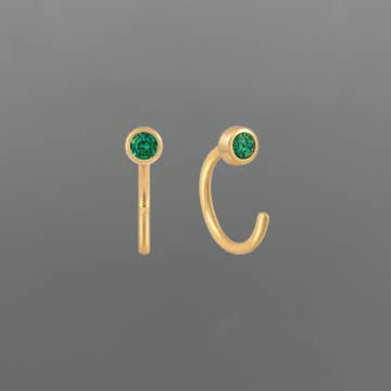 Our smallest hoop earring features a straight-back post with a mini cz that adds a pop of color. The hoop hugs the ear and can be worn anywhere. Tarnish Free - Long lasting protective coating safeguarding your jewelry from sweat, water, and more. Sterling Silver Posts – 18K gold plating over brass Hypoallergenic – Lead Free 2mm emerald CZ stone 7mm hoop opening