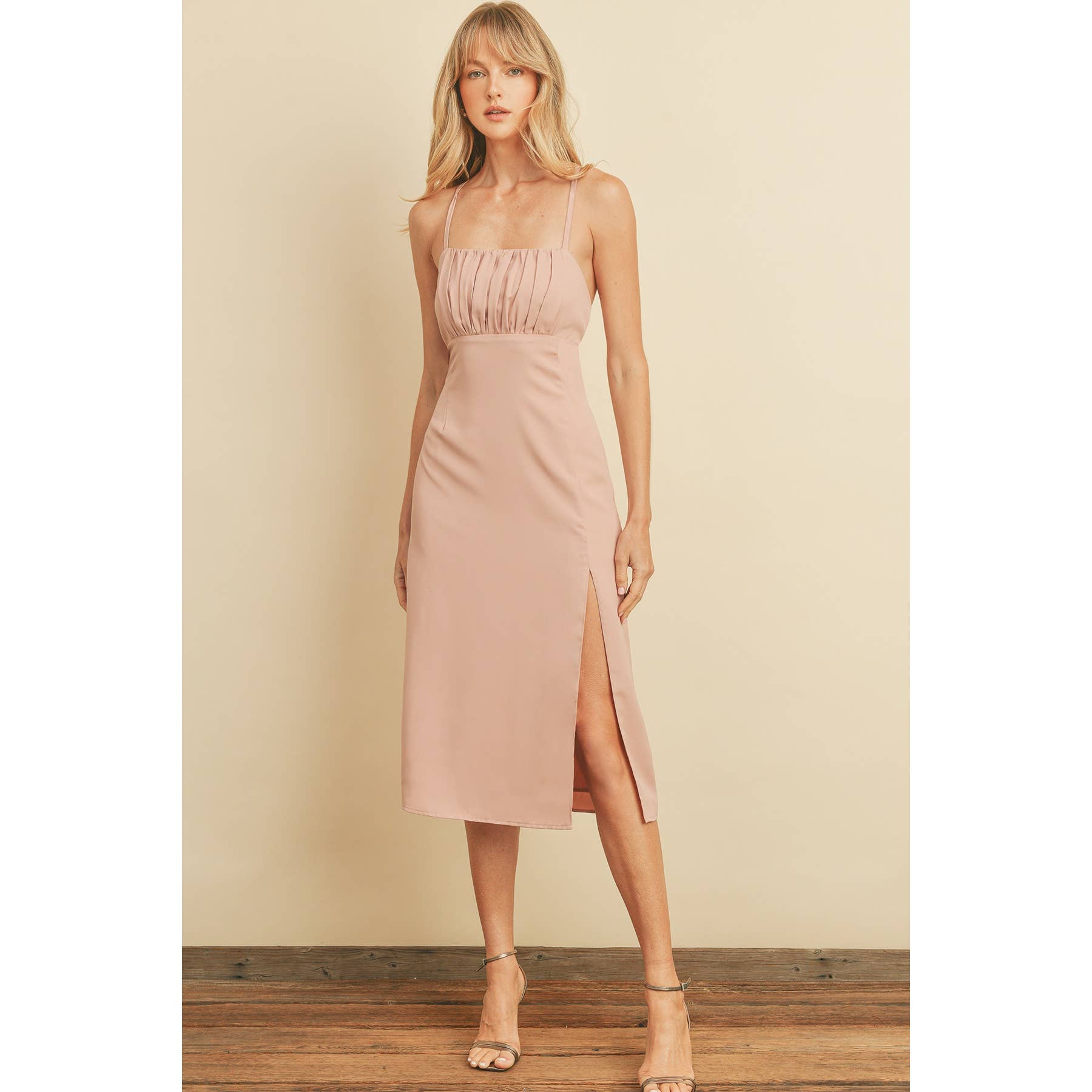 FT9717 Satin brami top with triangle bust with ruched seam, tie front detail, and adjustable cross back spaghetti straps. Smocked back panel for a better fit. Lined. Model is 5'10" and wearing size Small. Shell: 100% Polyester Lining: N/A