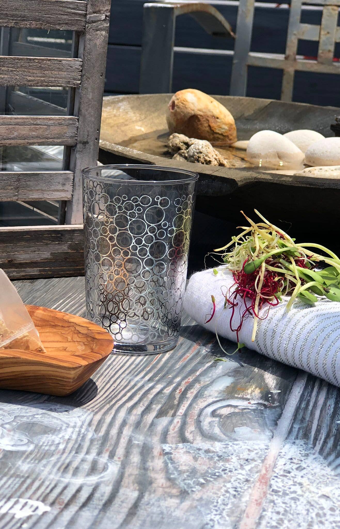 Beautifully hand painted with silver touch, this set of 6 frosted clear drinking glasses Perfect as a water, juice or even an elegant cocktail glass, you can also use it as an elegant votive holder to add some panache to your table Mixed them with their matching tea glasses to create an elegant ambiance 14 oz. capacity Hand wash