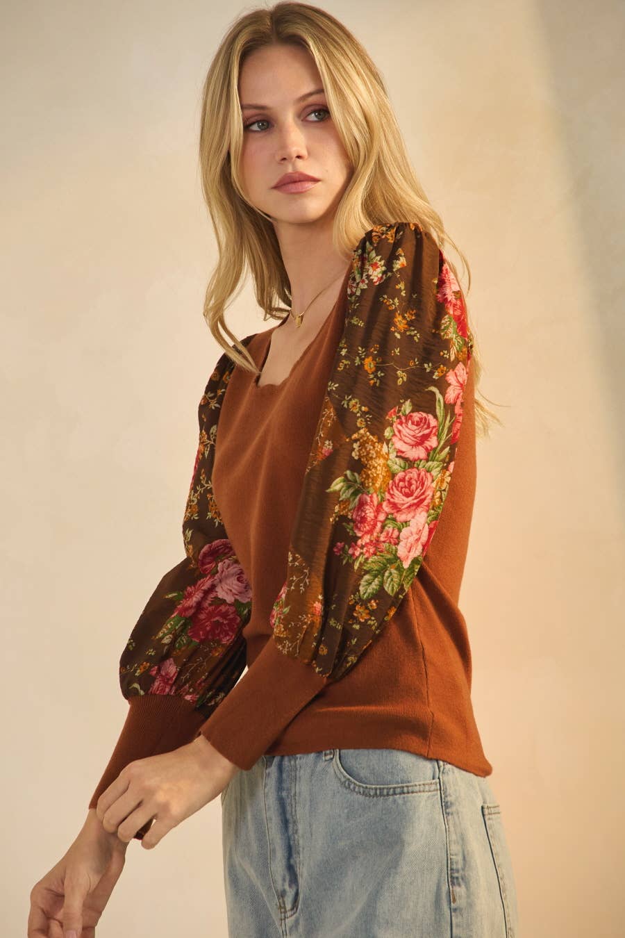 A sweater knit top featuring crew neckline and long puff sleeve Details Self : 54% Nylon 23% Acrylic 23% Polyester Size & Fit - Model is 5`8" And Wearing Size Small - Measurements Taken From Size Small - Approx. Length: 22"