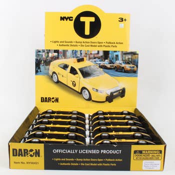 2189D - 5" Classic Taxi - New York. diecast collectible model car. This classic taxi cab has New York printed on doors is a 5" long die cast metal car with pullback motor action, opening doors. 12 pcs per display box and in yellow color.