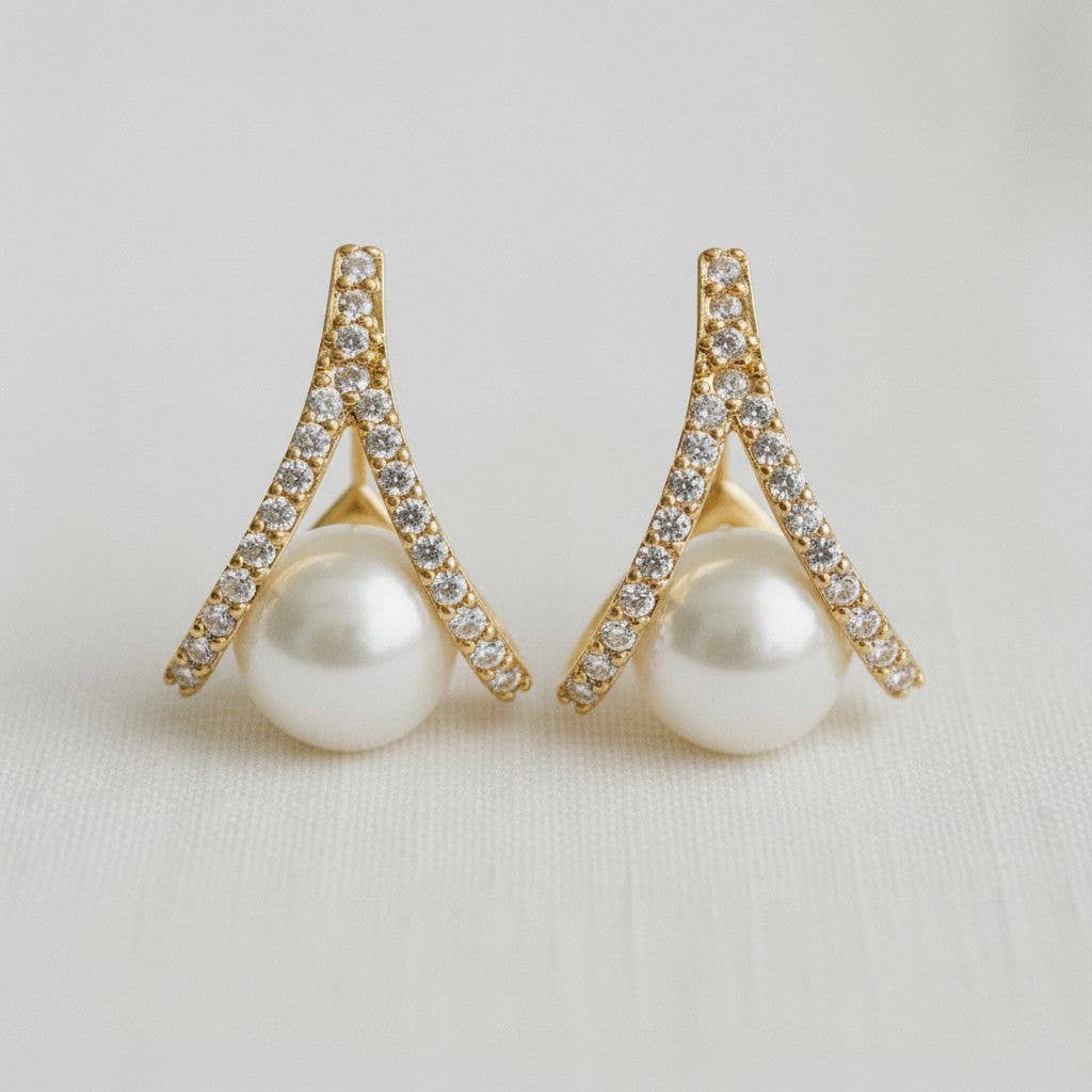 Wholesale White Pearl with Gold Micro Pave Mermaid Tail Stud Earring V-397