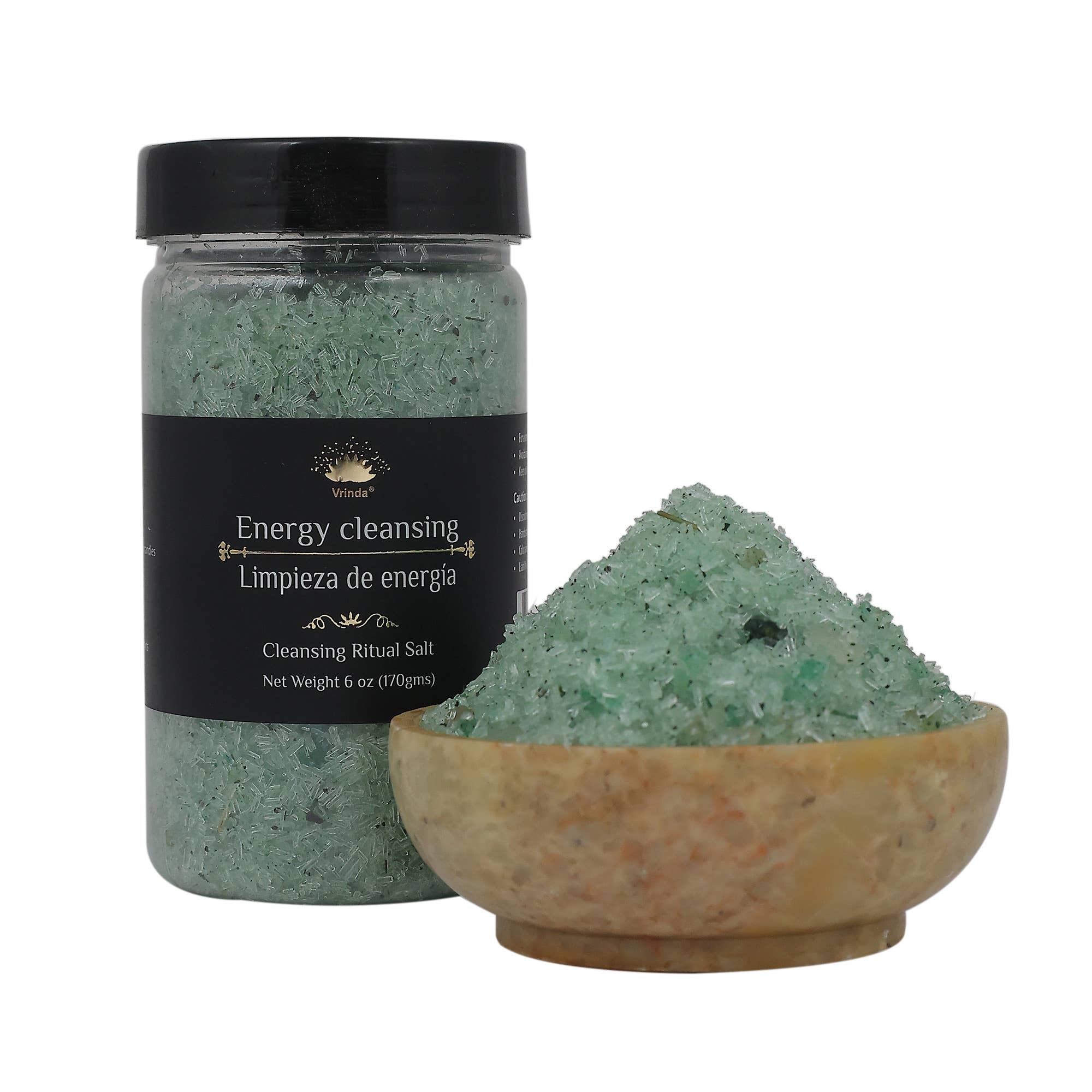 Made in United States Ingredients: Epsom salt, Pink Himalayan salt, dendritic salt, cedar leaf, green tea leaves, frankincense essential oil, rosemary essential oil, lime essential oil, clear quartz crystal Weight: 141.75 g (5 oz)