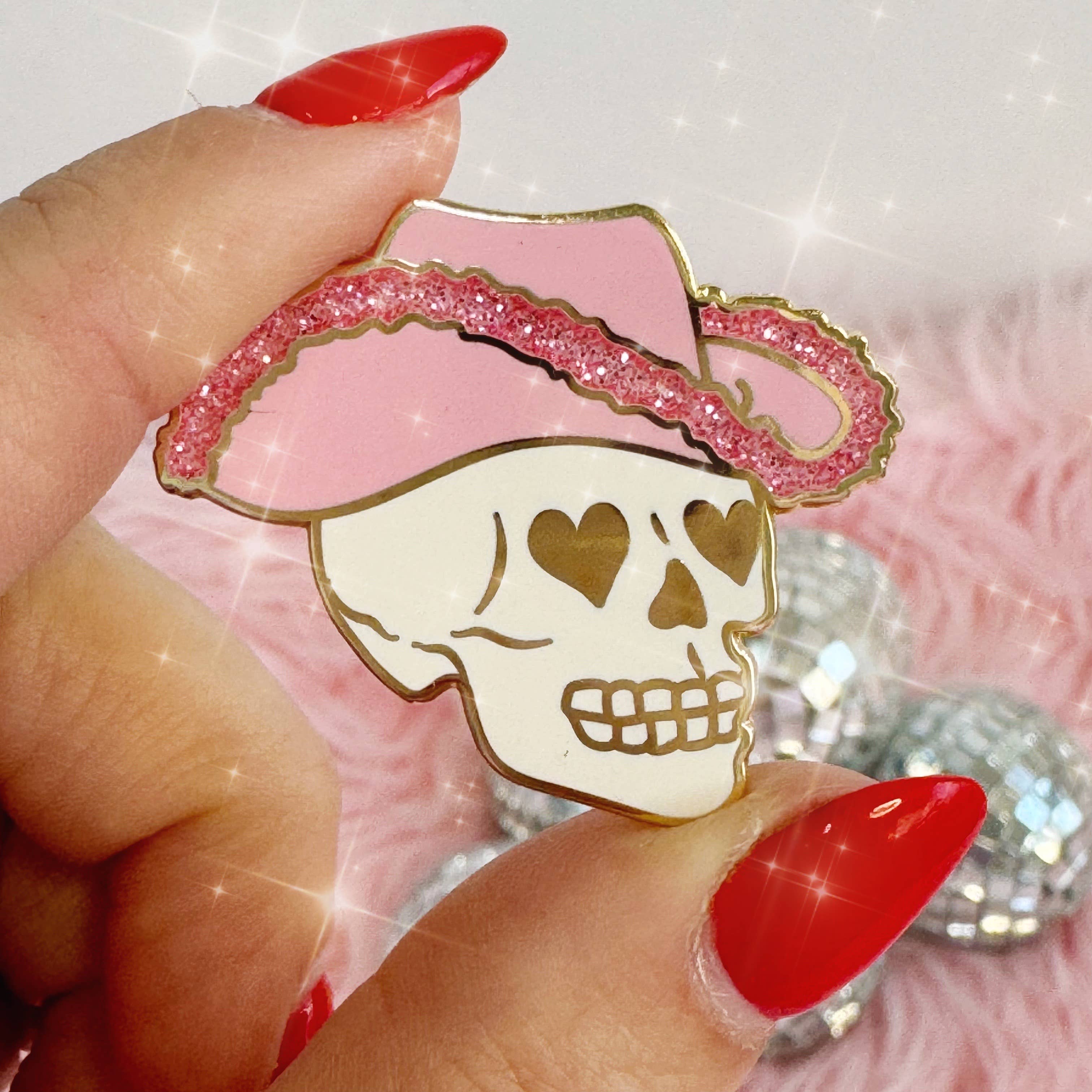 Pink Cowgirl Enamel Pin - perfect for Space Cowgirl - Disco Cowgirl themes & Bachelorette Parties (howdy Nashville, Austin!)!! Cute cowboy hat pin in bright pink glitter & gold enamel & detailed w/""""fluffy"""" trim & star! Let's Go Girls! Southwest - Western - Southern Details: ♥ Measures approx. 1 1/4"" w x 1/2"" h ♥ Materials: hard enamel & polished gold plating ♥ Designed by & exclusive to Wildflower + Co.; logo on backside ♥ Imported ♥ Packaged on our super cute backing card ♥ Product safety - intended for use by adults only; CA residents – see shop policies for Prop 65 warning ♥ Includes 1 pin