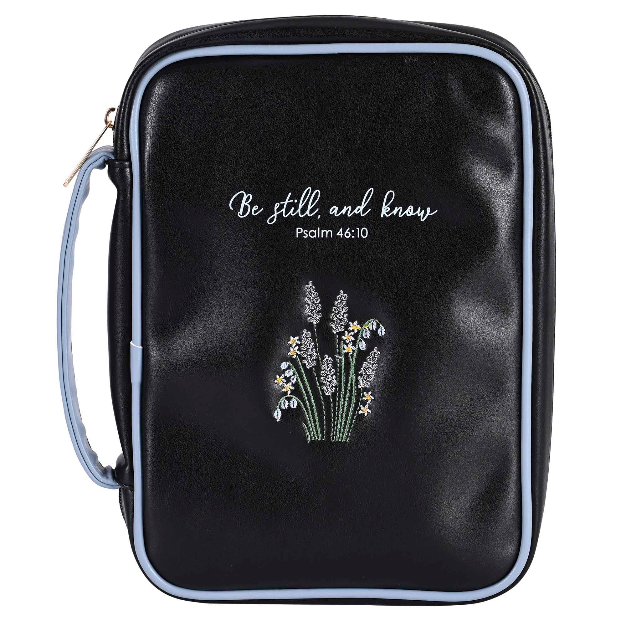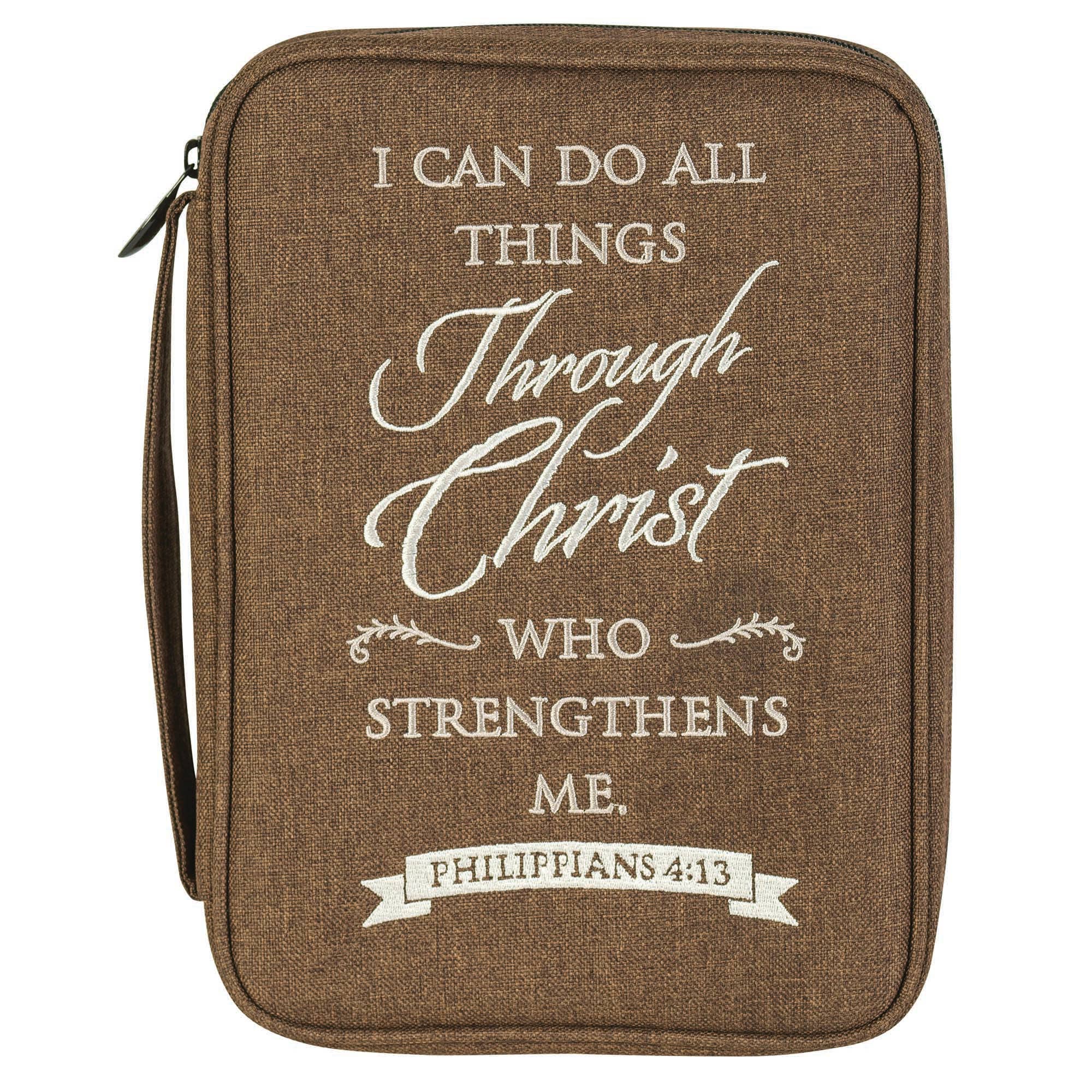 This Black Fabric Bible Cover Has A Sturdy 600 Denier Canvas Look Polyester With Nylon Reinforced Stitching. Non-Rusting And Self-Repairing Side Zipper. Carrying Handle At Side. Cover Lays Completely Flat When Open; Inside Is A Loop For Your Pen And An Attached Ribbon Bookmark. The Large Size Holds A Bible Or Book Up To About 7 1/8 x 2 x 10 1/4. Blue And White Printed Serenity Prayer Reads: God Grant Me the Serenity To Accept The Things I Cannot Change; Courage To Change The Things I Can; And Wisdom To Know The Difference.