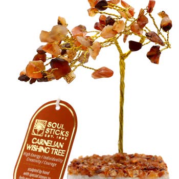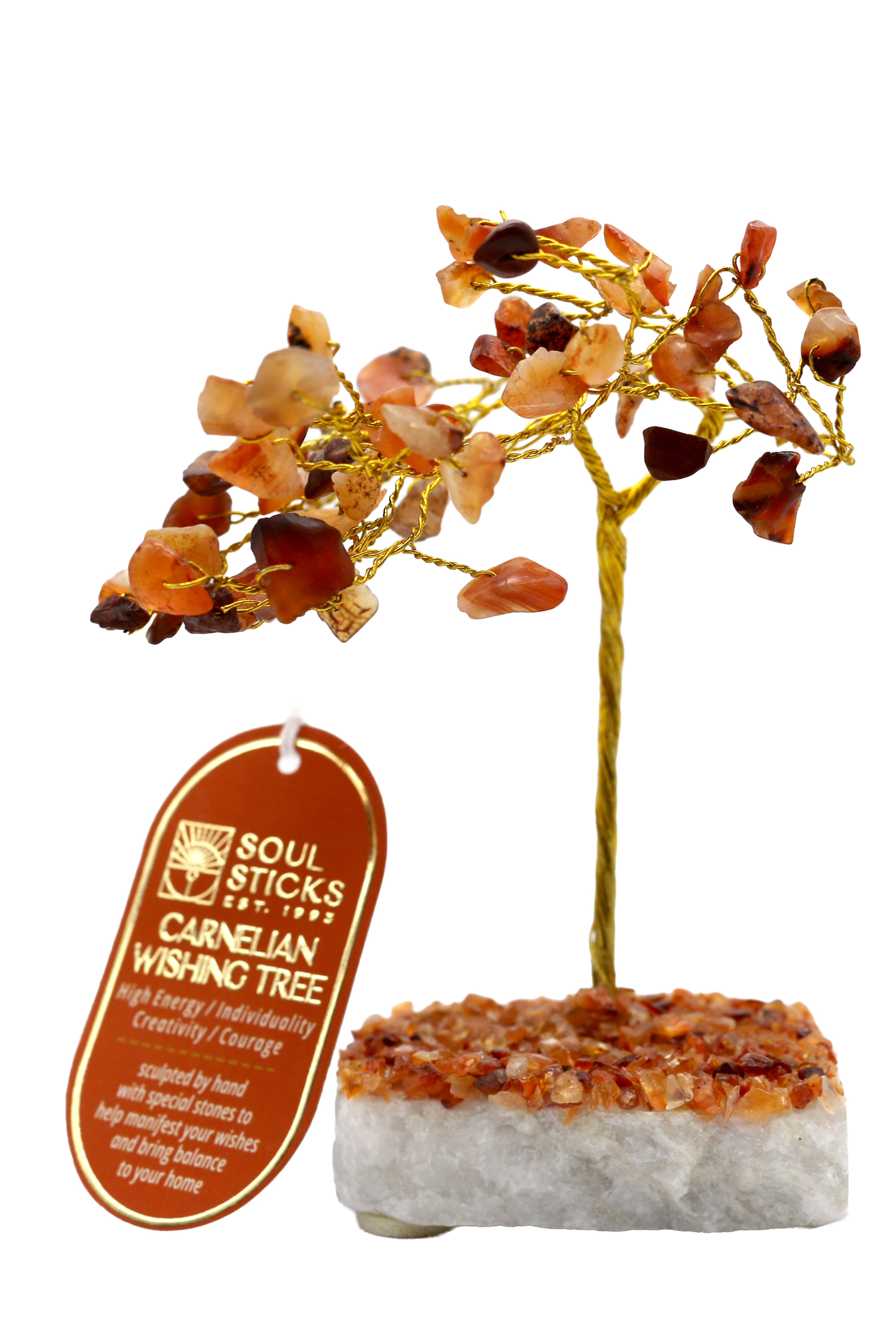 Clear Quartz and Red Carnelian Natural Gemstone Tree Hand crafted Gemstone Tree, made from Natural Gemstones into the 'tree of life'. CLEAR QUARTZ CRYSTAL: Clear Quartz is also known as Crystal Quartz or Rock Crystal and it symbolized space, purity and patience, enhances spiritual growth, spirituality and wisdom. RED CARNELIAN CRYSTAL is a brownish-red mineral which is commonly used as a semi-precious gemstone. Carnelian is a variation of the silica mineral chalcedony colored by impurities of iron oxide. The Red Carnelian Crystal Gemstone Tree is beautifully crafted using copper wiring on a wonderful wood and crystal base. Made with natural rock crystal gemstones. Description: 500 Natural Quartz and Red Carnelian Gemstone chips Natural Stone Wooden Base Height: 10 inches (approx.)