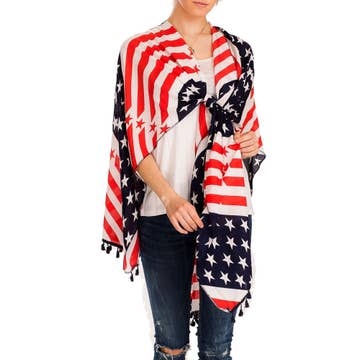 Celebrate in style with our 4th of July Vintage American Flag Printed Kimono Cover Up. Color and Pattern: Featuring a classic American flag print with a vintage twist, the rich hues of red, white, and blue create a striking look that’s both eye-catching and meaningful. Material: Made from 100% viscose, this kimono is ultra-soft and lightweight, offering a breathable feel that’s ideal for warm days. Design: With its flowing silhouette and open-front style, this kimono drapes beautifully over any outfit, providing a comfortable and relaxed fit. The generous sizing ensures it can accommodate up to a 1XL, making it a versatile addition to any wardrobe. Details: The kimono is finished with a smooth texture and a slightly sheer appearance, enhancing its airy and festive vibe. Whether you're watching fireworks, enjoying a backyard barbecue, or celebrating America's independence, this cover-up is a must-have for your festivities.