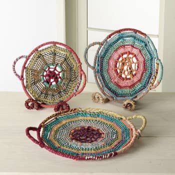 Coiled rope tray made with brown cotton cord and blocks of variegated teal and marigold thread. Small: Approximately 4.5" x 4.5" x 1.5" Medium: Approximately 6" x 6" x 2" Large: Approximately 8" x 8" x 2.5" Due to the handmade process, slight variations in size and pattern are to be expected. Made in San Francisco