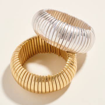 The Geo Collection is Time less celebration of Classic Jewelry that is always perfect, The Cobra Bangle is no exception. We are so excited to make this our way. Steel That is PVC plated for years of wear without tarnish. Then spring coiled to be the perfect flex bangle. This gently stretches to fit over your hand then settles perfectly and very softly on the wrist allowing all day wear. No clinking and clunking. They flex with you and lay perfectly flat. The design you will never take off. Special Occassion to jeans and T's. Ultra high shine 14K gold and Rhodium finish. Hypoallergenic Waterproof Light weight This is perfected quality. Lifelong wear size is width of band 10mm slender, 12mm slightly thicker