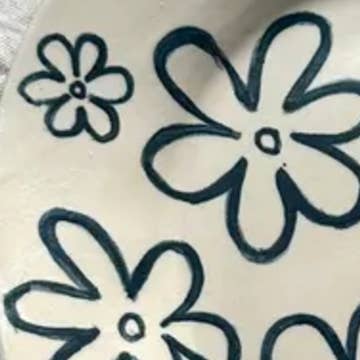 A medium sized platter with a hand-painted wiggle. Made with white stoneware and decorated with blue slip. H:3cm W:25cm L:32cm