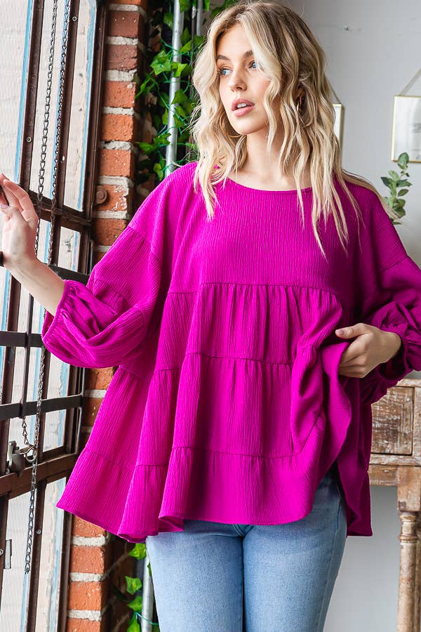 - Embossing textured top with U-neck, long peasant sleeves, and ribbed hems. - non-sheer, lightweight. - Model is 5'8'' and is wearing a Small - 95% POLYESTER 5% SPANDEX