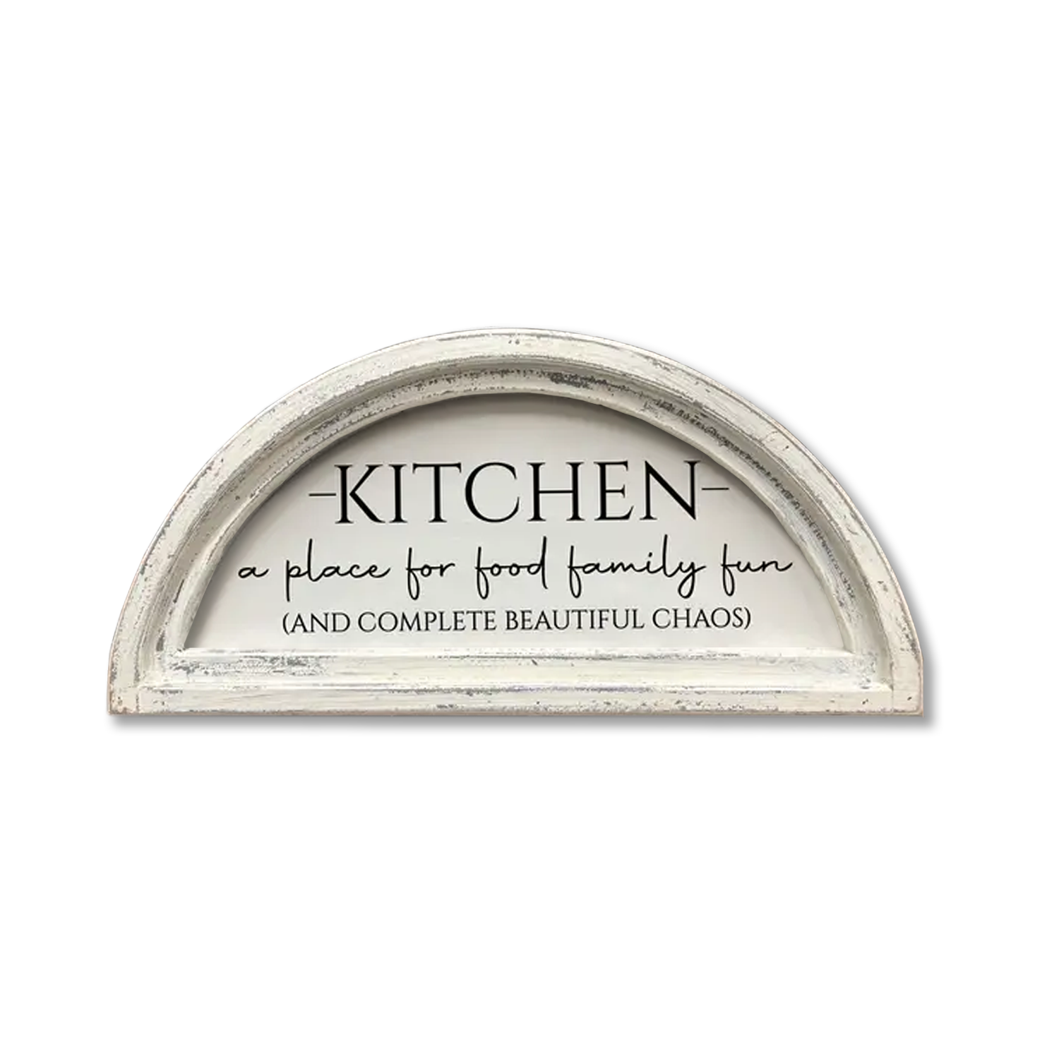 The Kitchen Metal Sign is a horizontal metal sign featuring white paint and a distressed look and texture. The sign reads “Kitchen” in bold black letters and displays a black rolling pin silhouette that reads “bring families together” in white scripted text. This sign is a beautiful addition to any kitchen, fits especially well with farmhouse décor, and includes two sawtooth hangers on the back for a wall display. Measures 6.5” high by 24” wide by .5” deep.