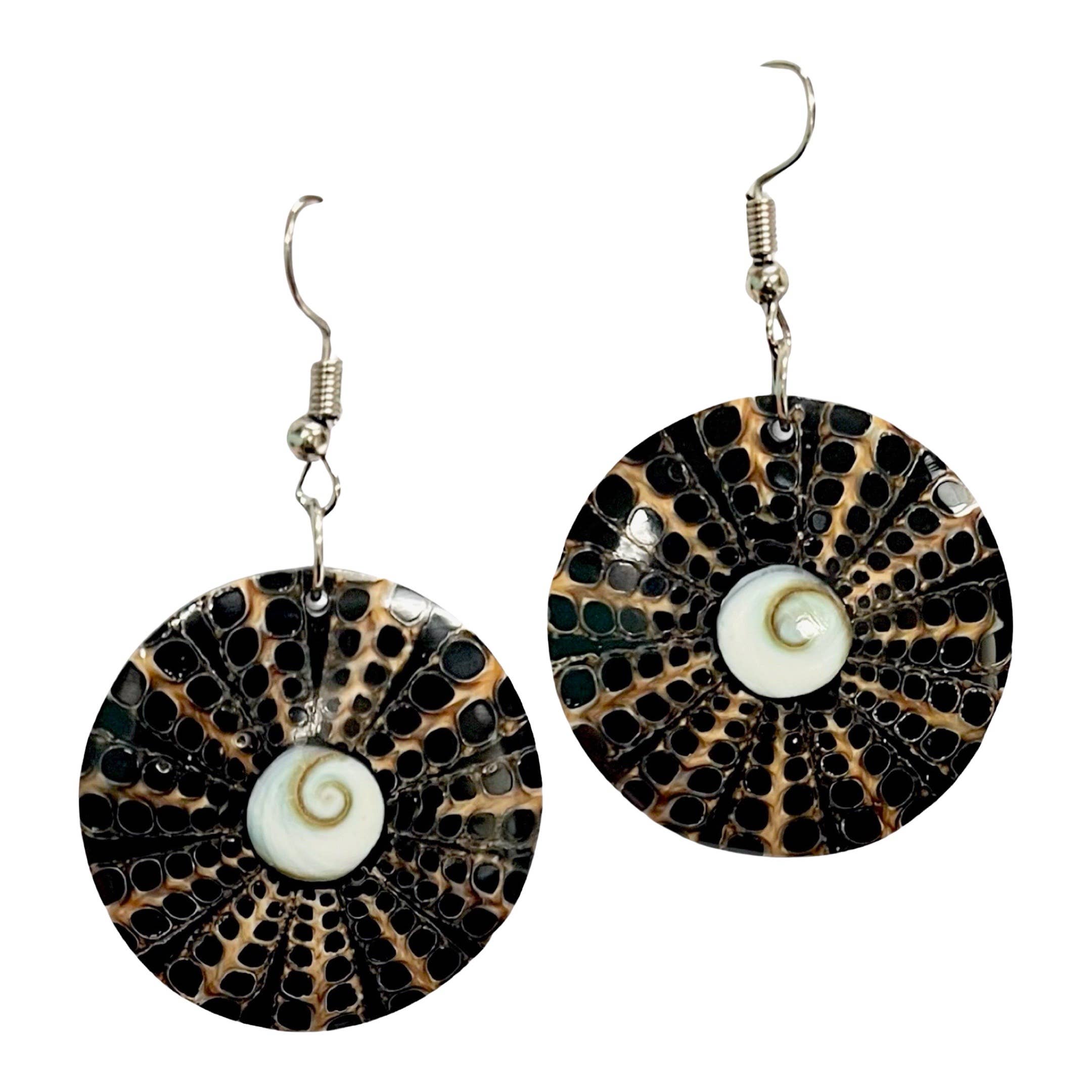 Natural dark half disks dropped from a post. Buffalo horn is a natural material, each item has a unique character and may vary from image. 1.25" drop