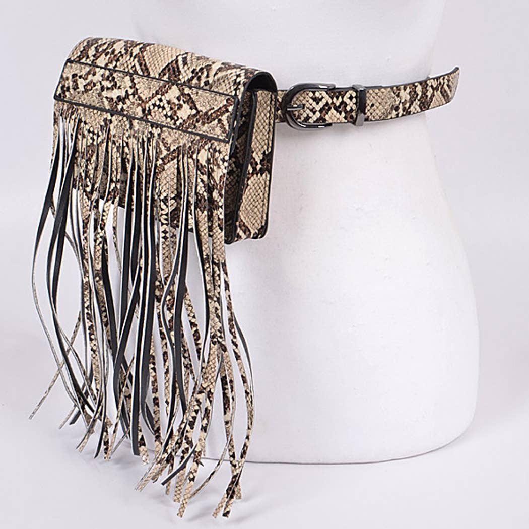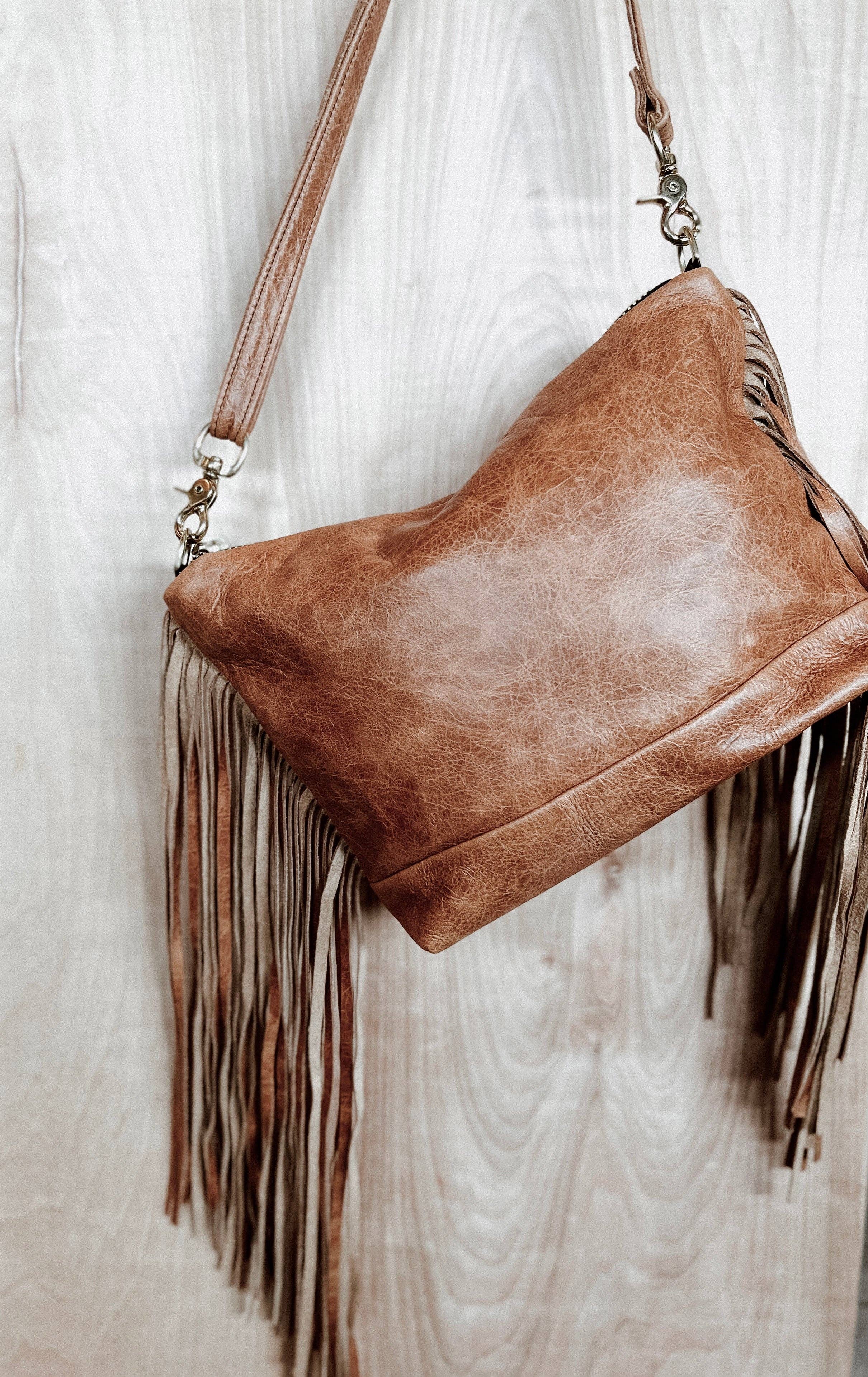Espresso brown deer skin marty hip bag designer purse. Turquoise washed Venetian print, oak leaf print and gator leather lid. Fringe is 7" at longest point from bottom of hip bag. Average dimensions on marty bag averages 7"x 1.5" x 5" for bag compartment. Adjustable shoulder or belt strap included. Magnetic closure lid. Zipped top. Interior credit card or easy access pocket. Hands free purse.