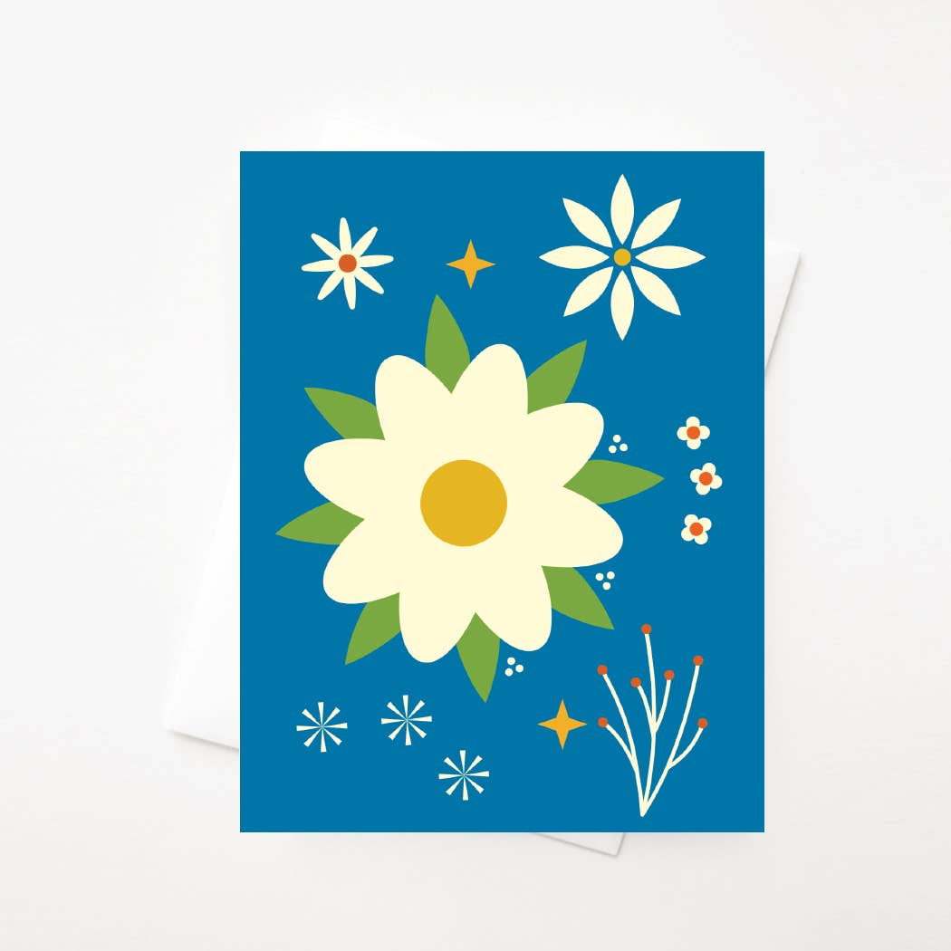 This card is hand silk-screened with blue and green ink on 100# French’s recycled Sour Apple Pop-tone cover, and comes with a white envelope. The inside is left blank for your own message. This card is sold as a single. Each single comes in a clear sleeve. Finished size is A2 (5.5 × 4.25").